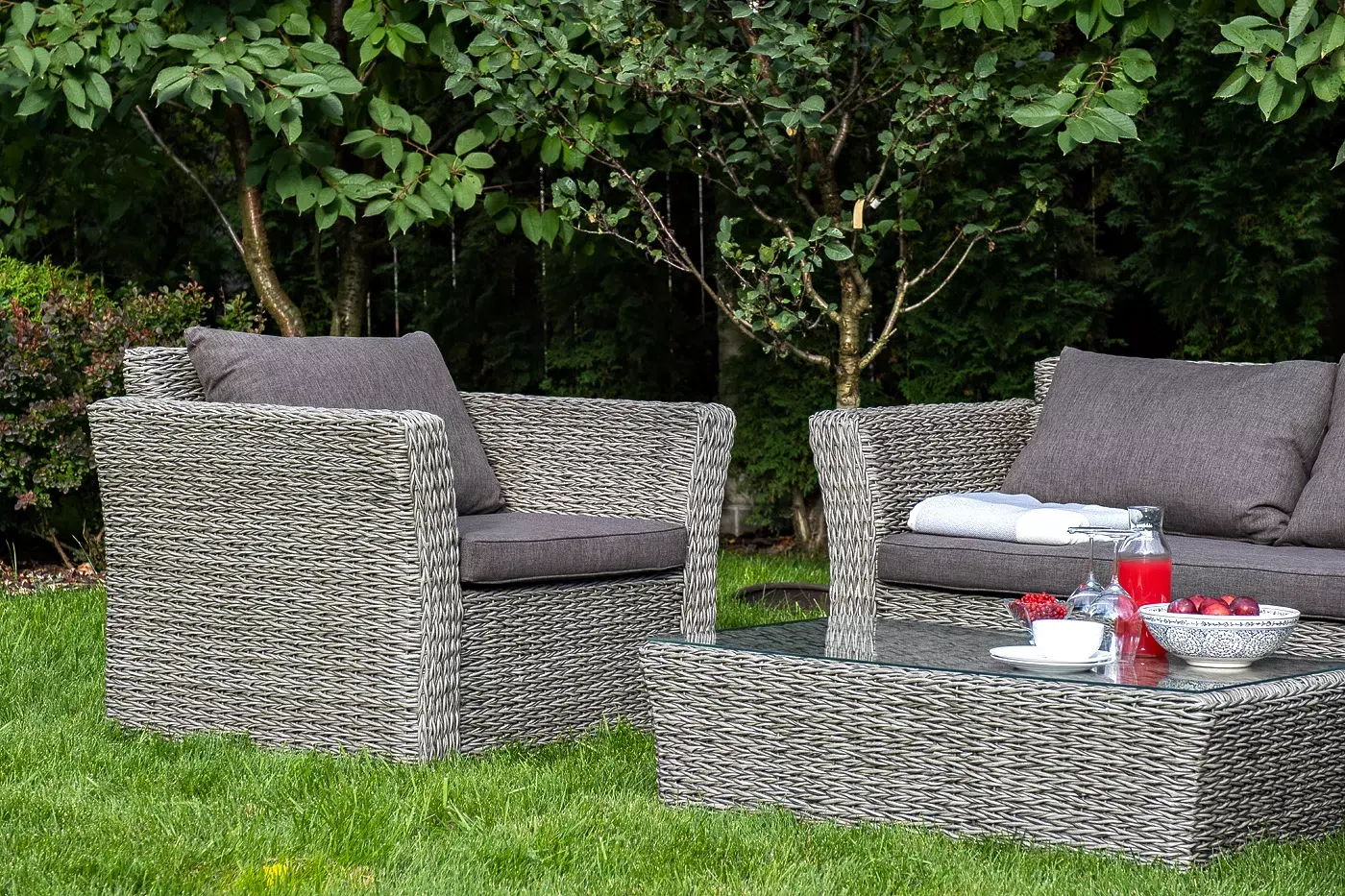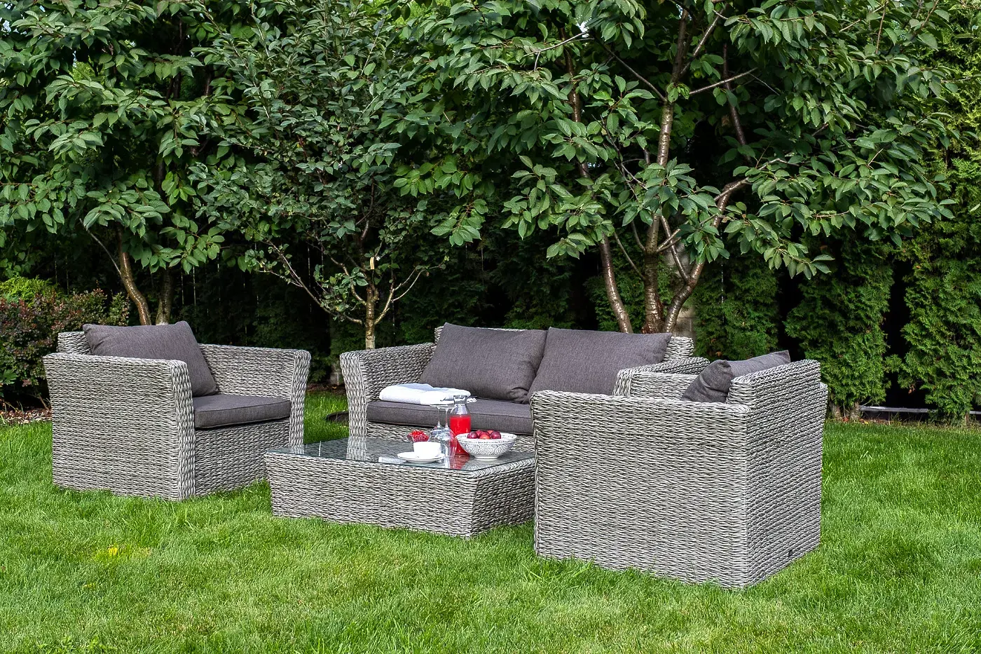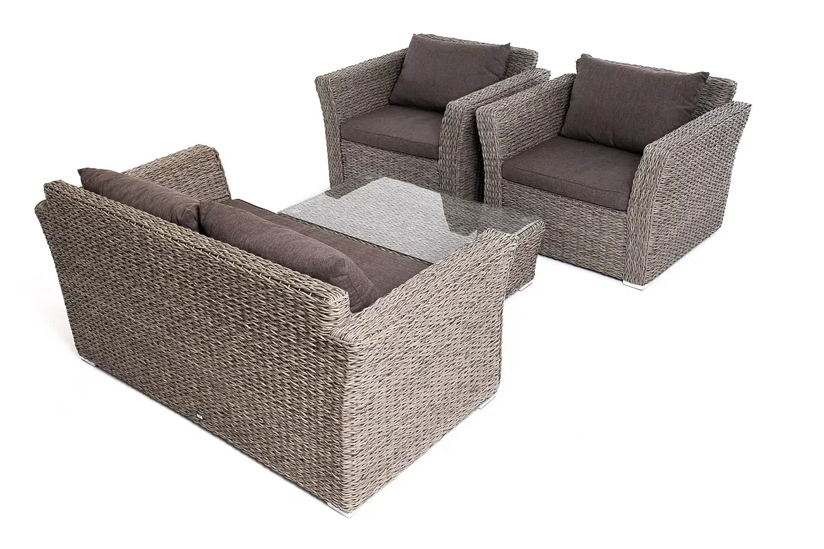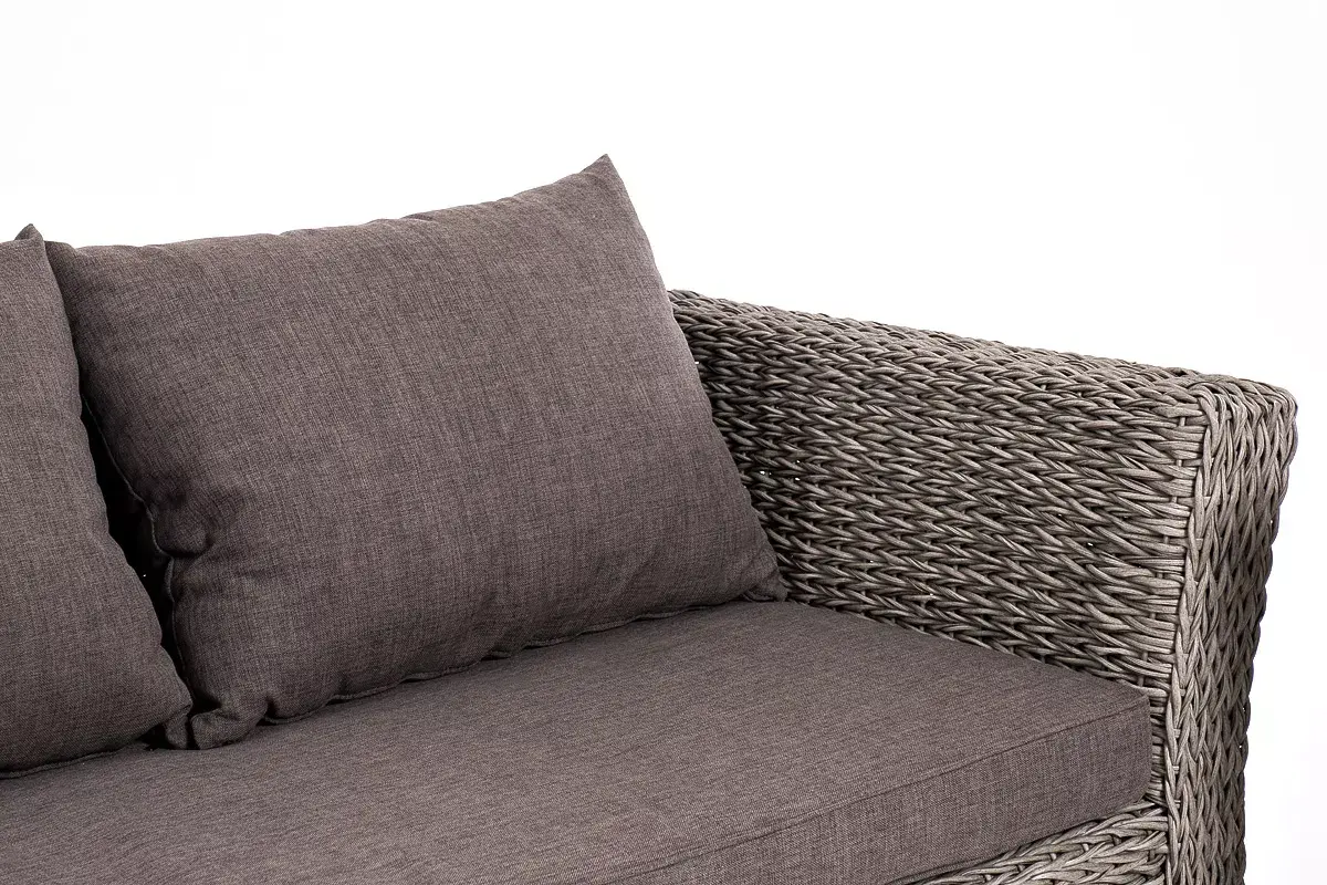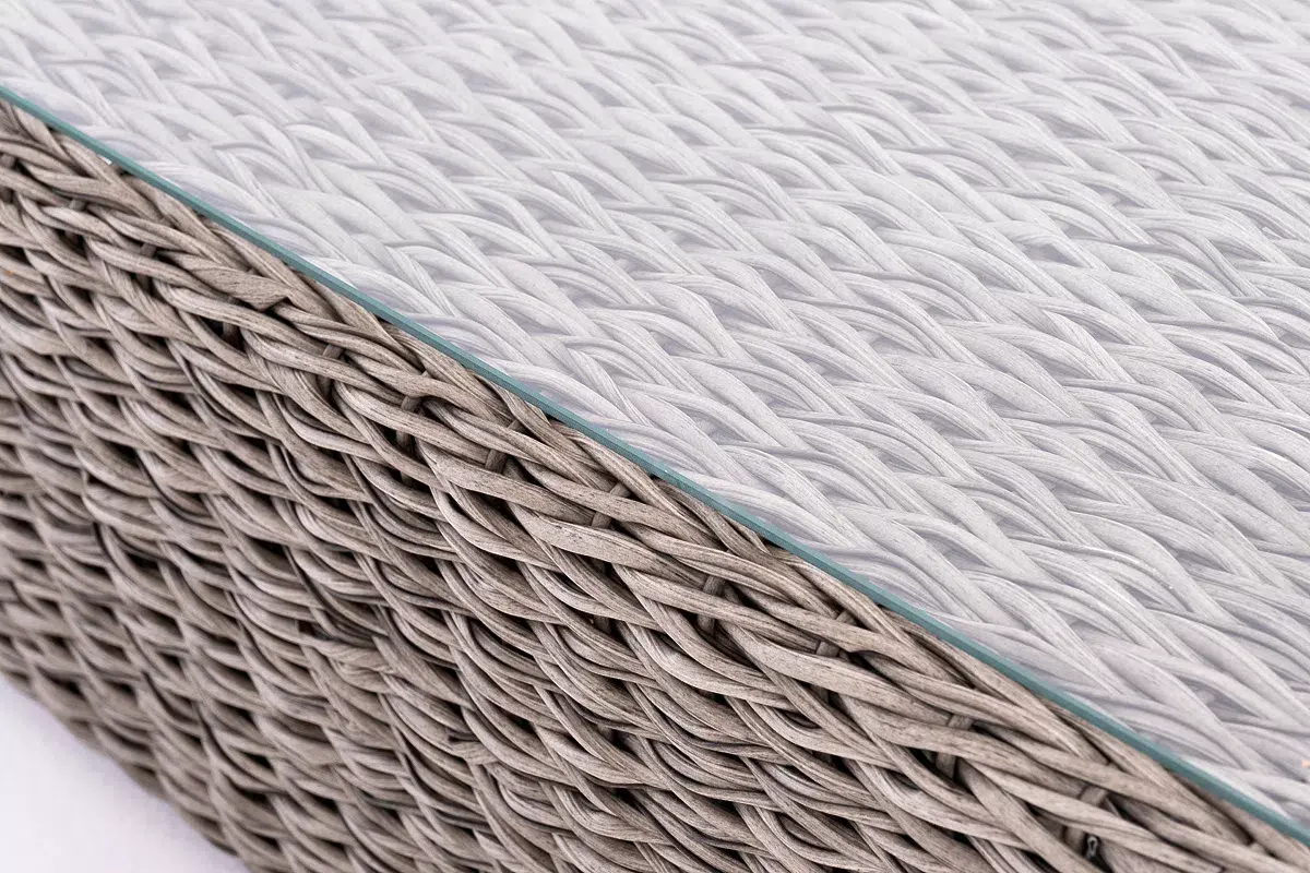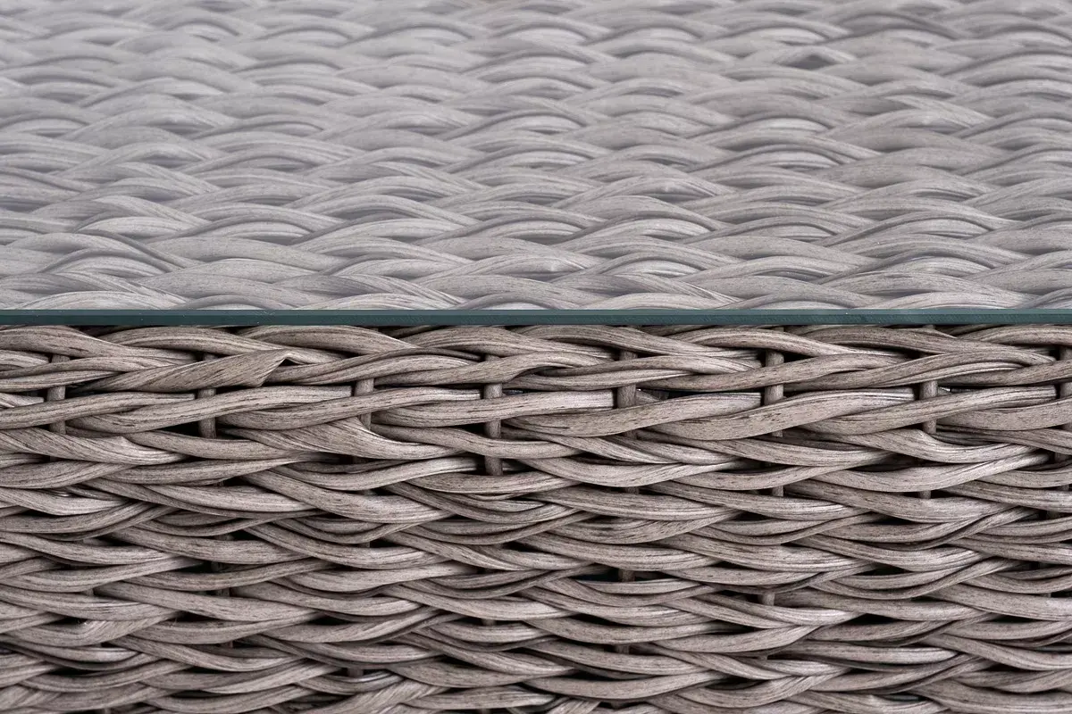 Прочный алюминиевый каркас усиливает устойчивость мебели. Его дополняет плетение в сером цвете, которое представлено из искусственного ротанга вида "гиацинт".