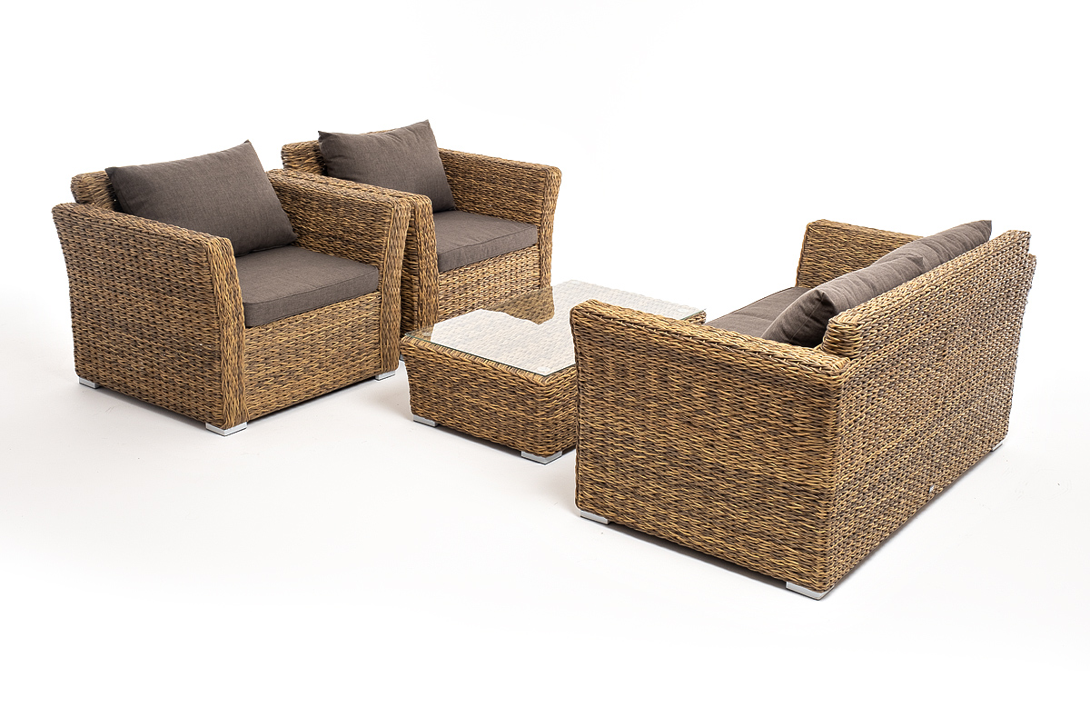 Прочный алюминиевый каркас усиливает устойчивость мебели. Его дополняет соломенная оплетка, которая представлена из искусственного ротанга вида "гиацинт".