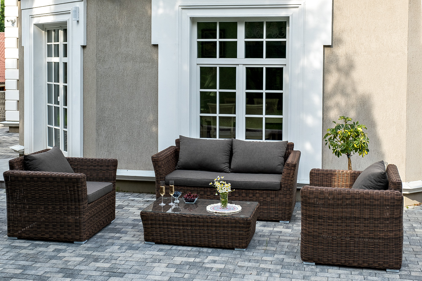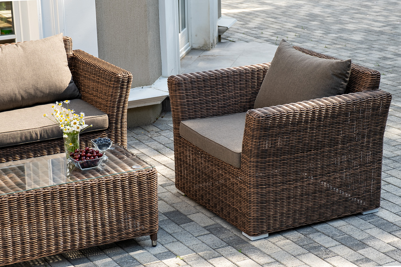 Мебель изготовлена из алюминиевого каркаса и круглого искусственного ротанга, которым вручную оплетается корпус. Цвет комплекта – коричневый.