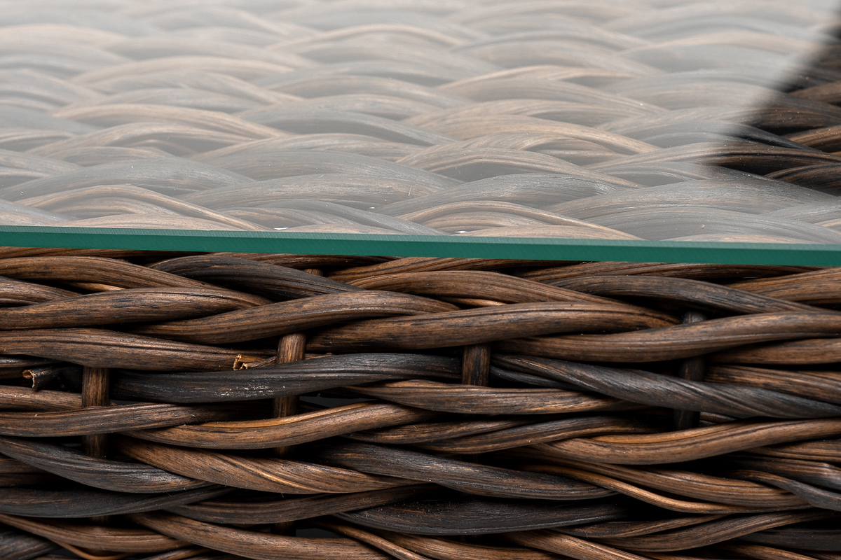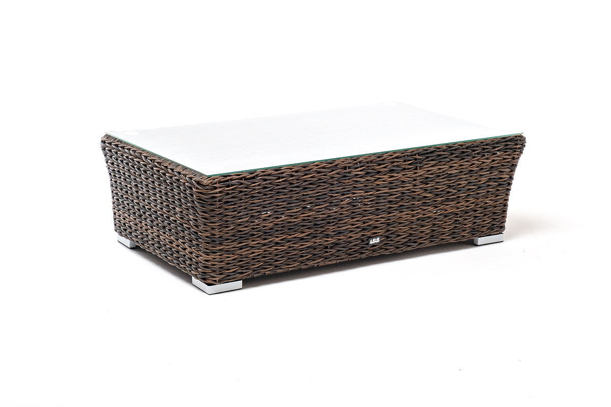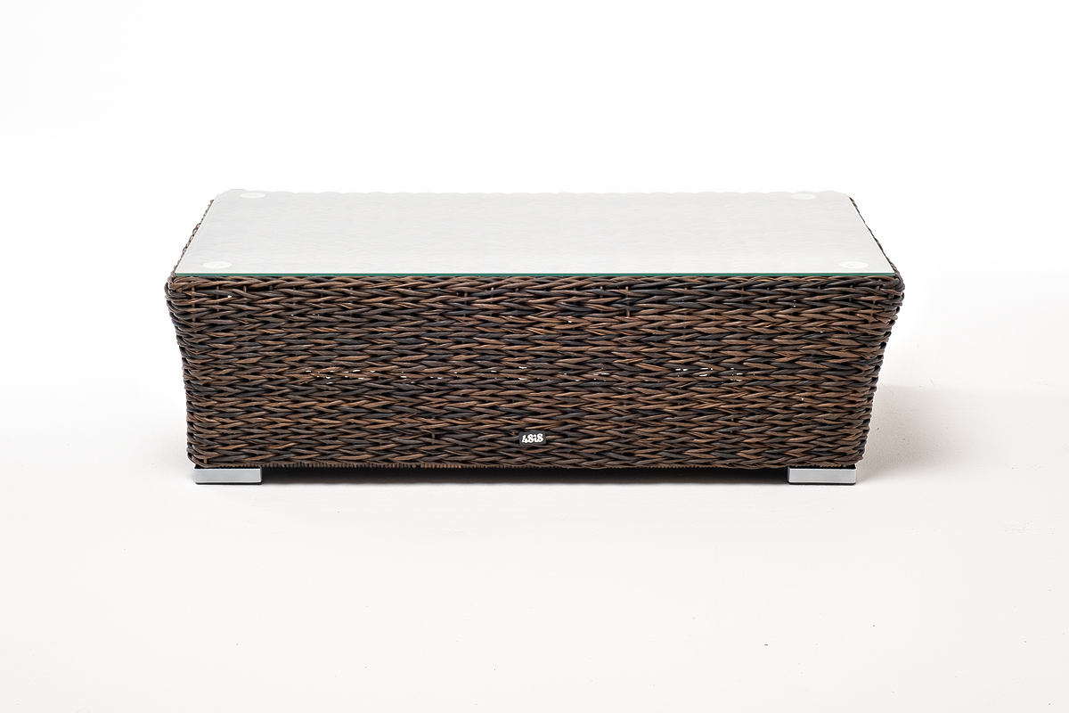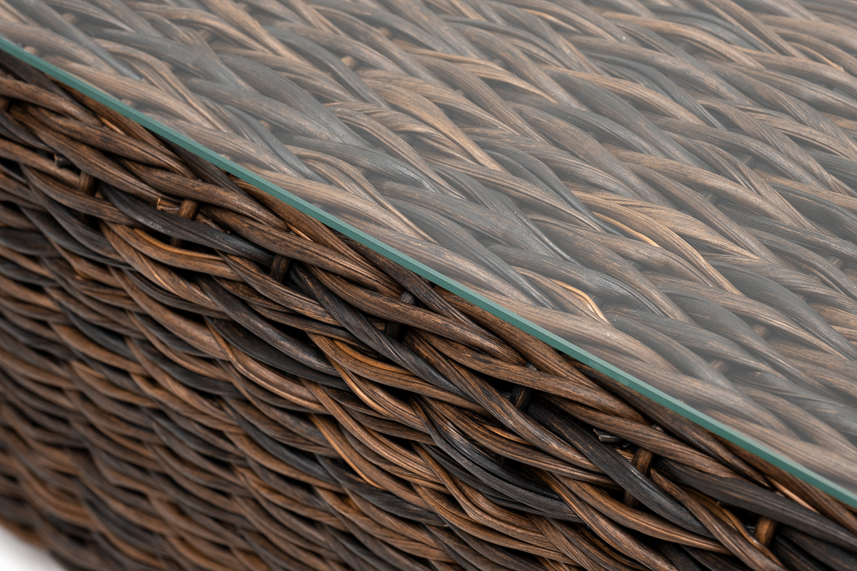 Размер модели – 1100×660×340 мм. Устойчивость и прочность ей придает каркас, выполненный из высококачественного алюминия. Каркас оплетен вручную с помощью искусственного ротанга вида "гиацинт". Мебель выполнена в коричневом цвете.