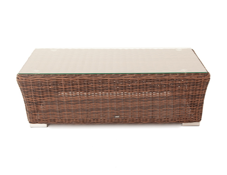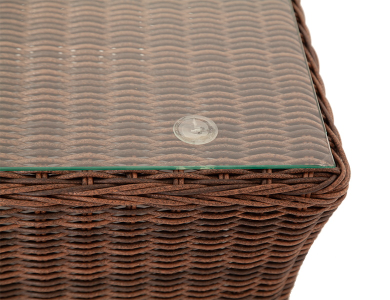 Размер модели – 1100×660×340 мм. Алюминиевый каркас принимает на себя основную нагрузку и отвечает за надежную фиксацию всей конструкции. Искусственным ротангом полностью оплетен каркас, включая верхнюю поверхность столика. Ротанг имеет круглое плетение коричневого цвета.