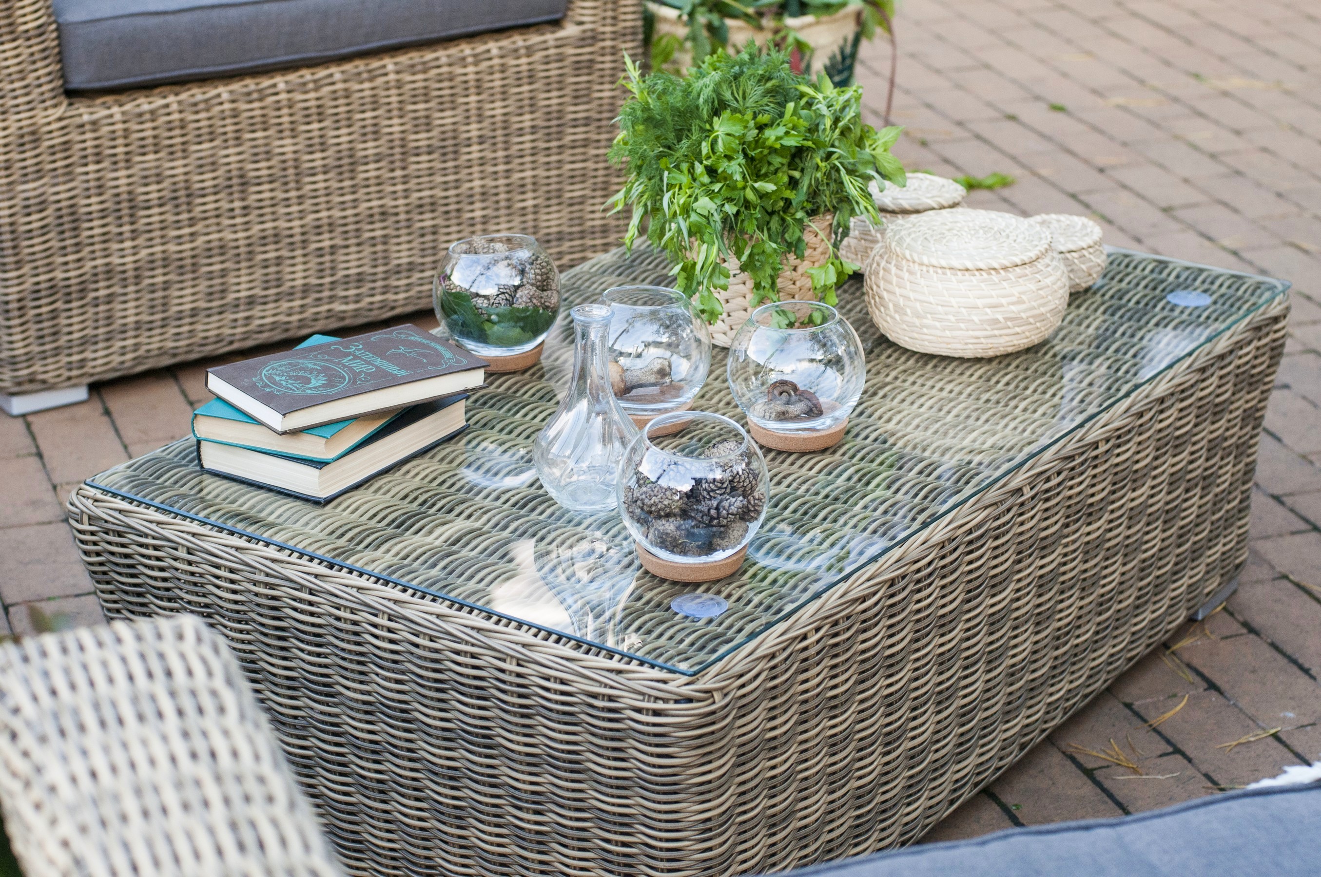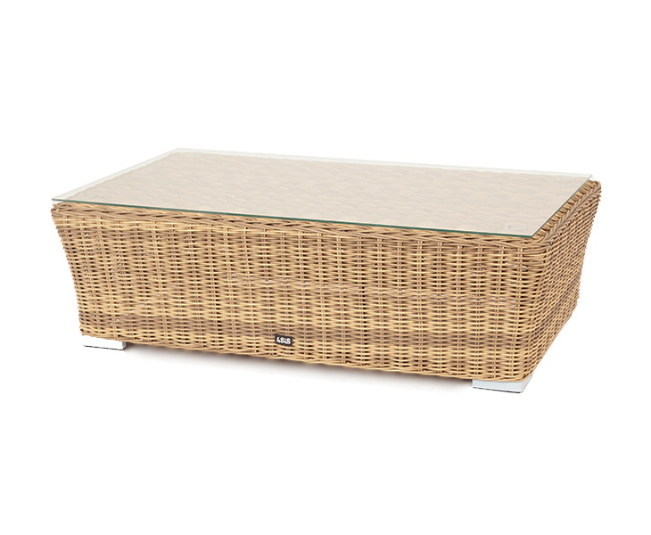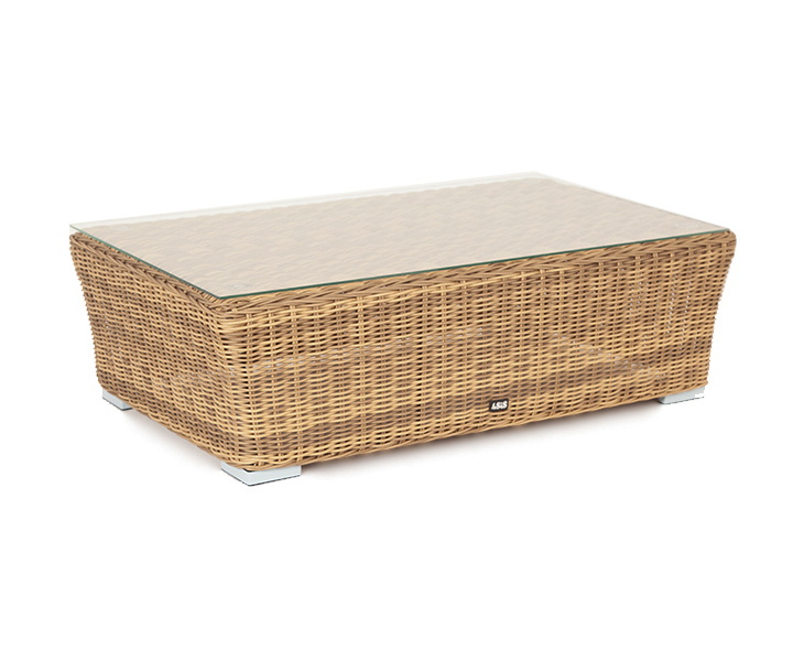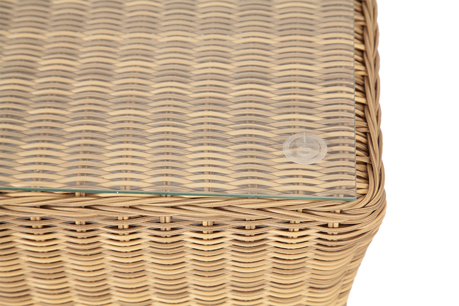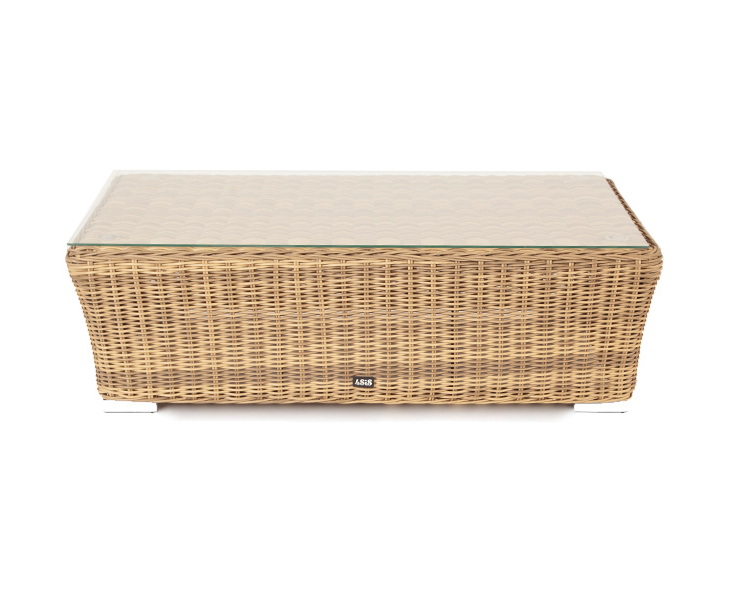 Размер модели – 1100×660×340 мм. Устойчивость и прочность ей придает каркас, выполненный из высококачественного алюминия. Каркас оплетен вручную с помощью круглого искусственного ротанга. Мебель выполнена в соломенном цвете.