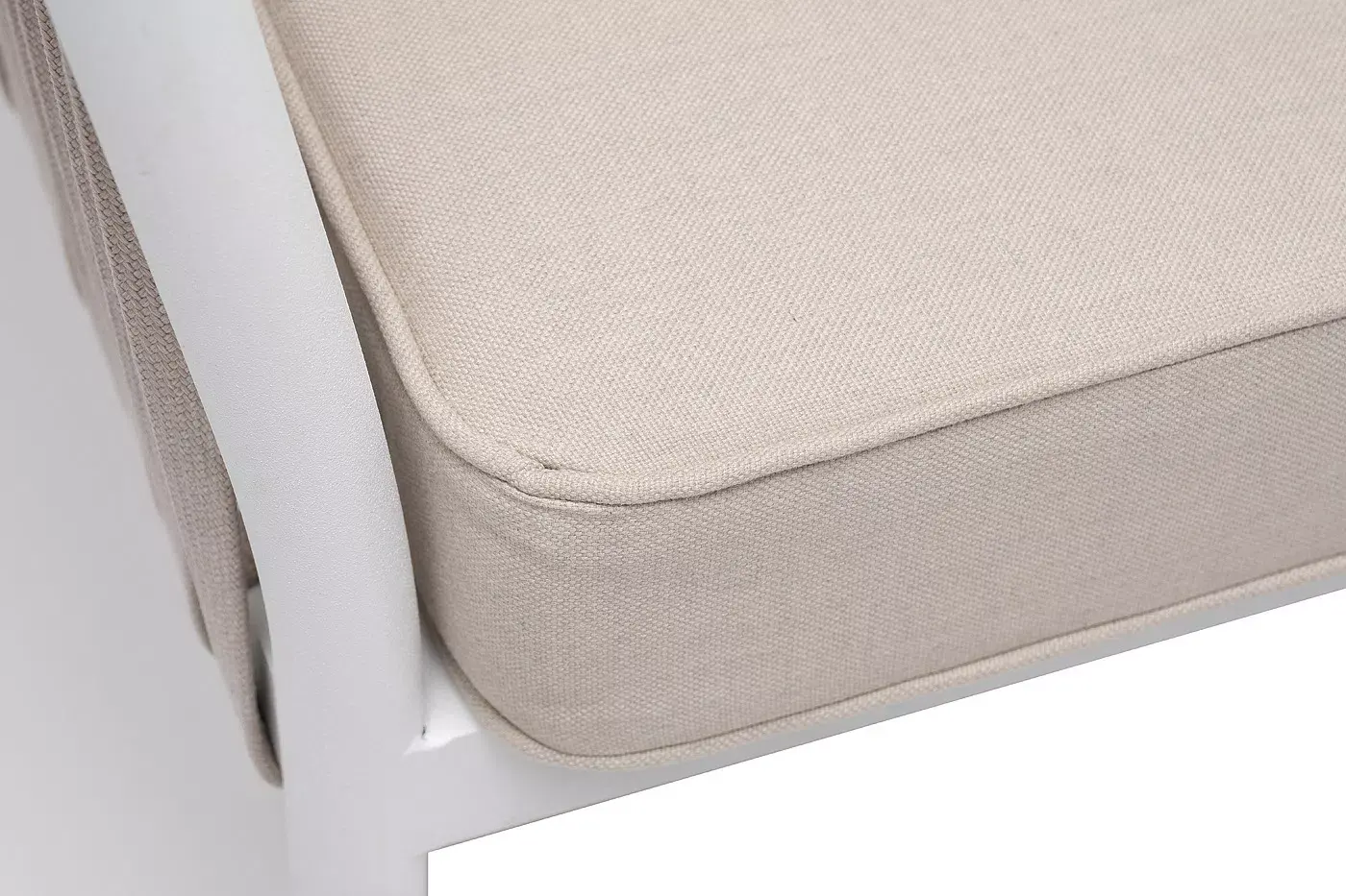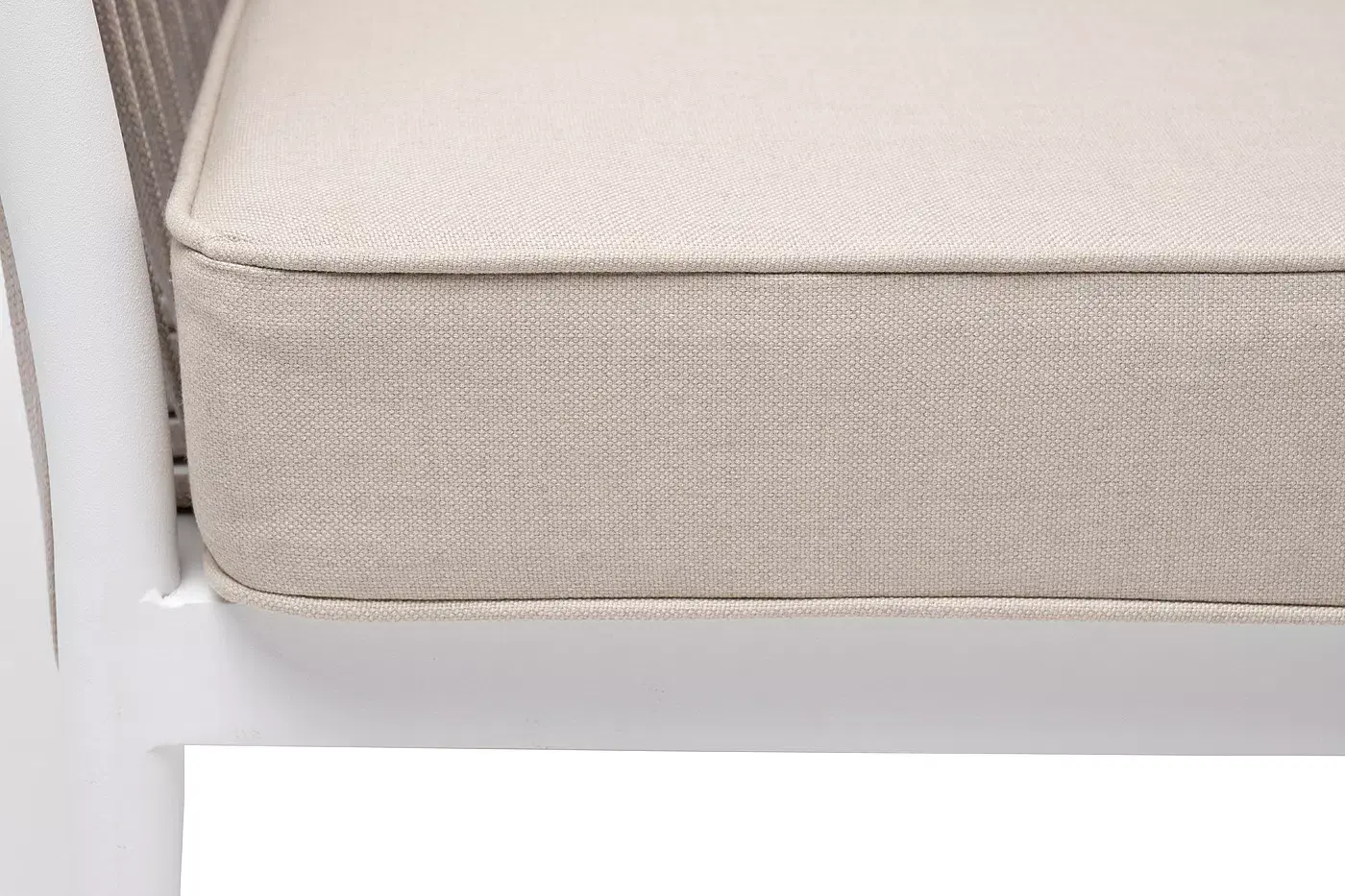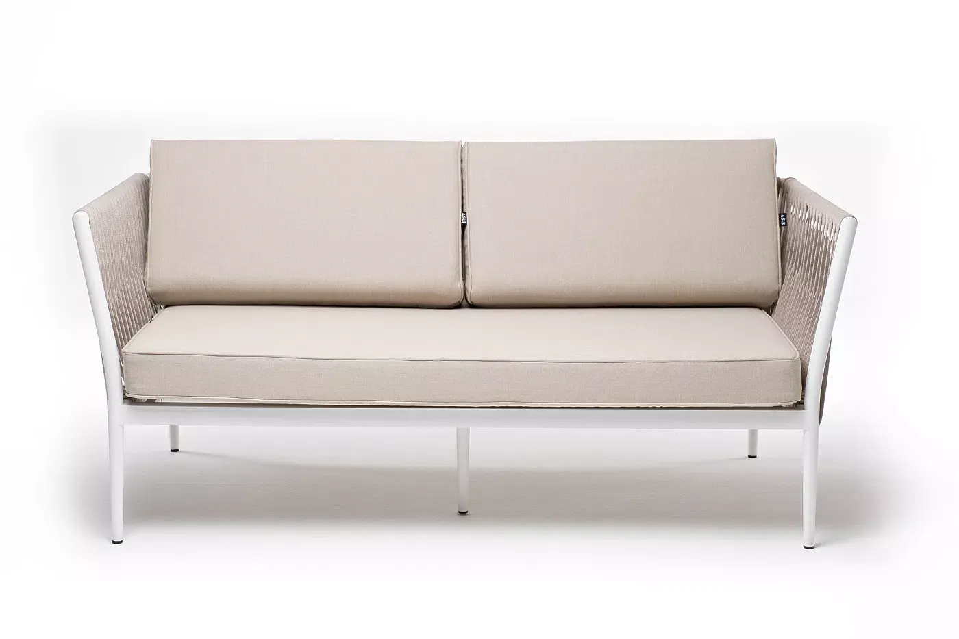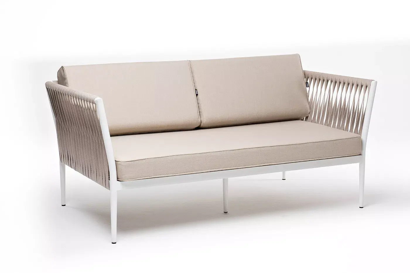 Диван имеет алюминиевый каркас, окрашенный порошковой краской в белый цвет. Боковины каркаса вручную оплетены роупом - эластичными синтетическими лентами, изготовленными из высокопрочных полиэфирных волокон. Цвет оплетки - бежевый.