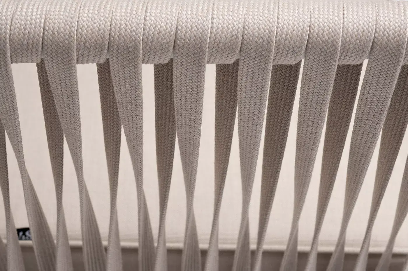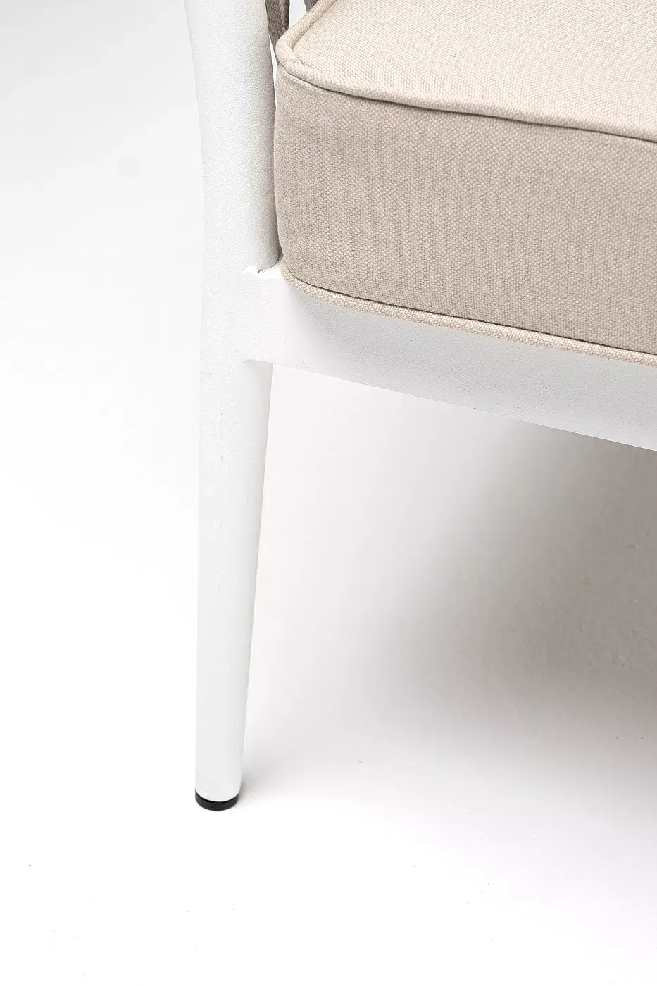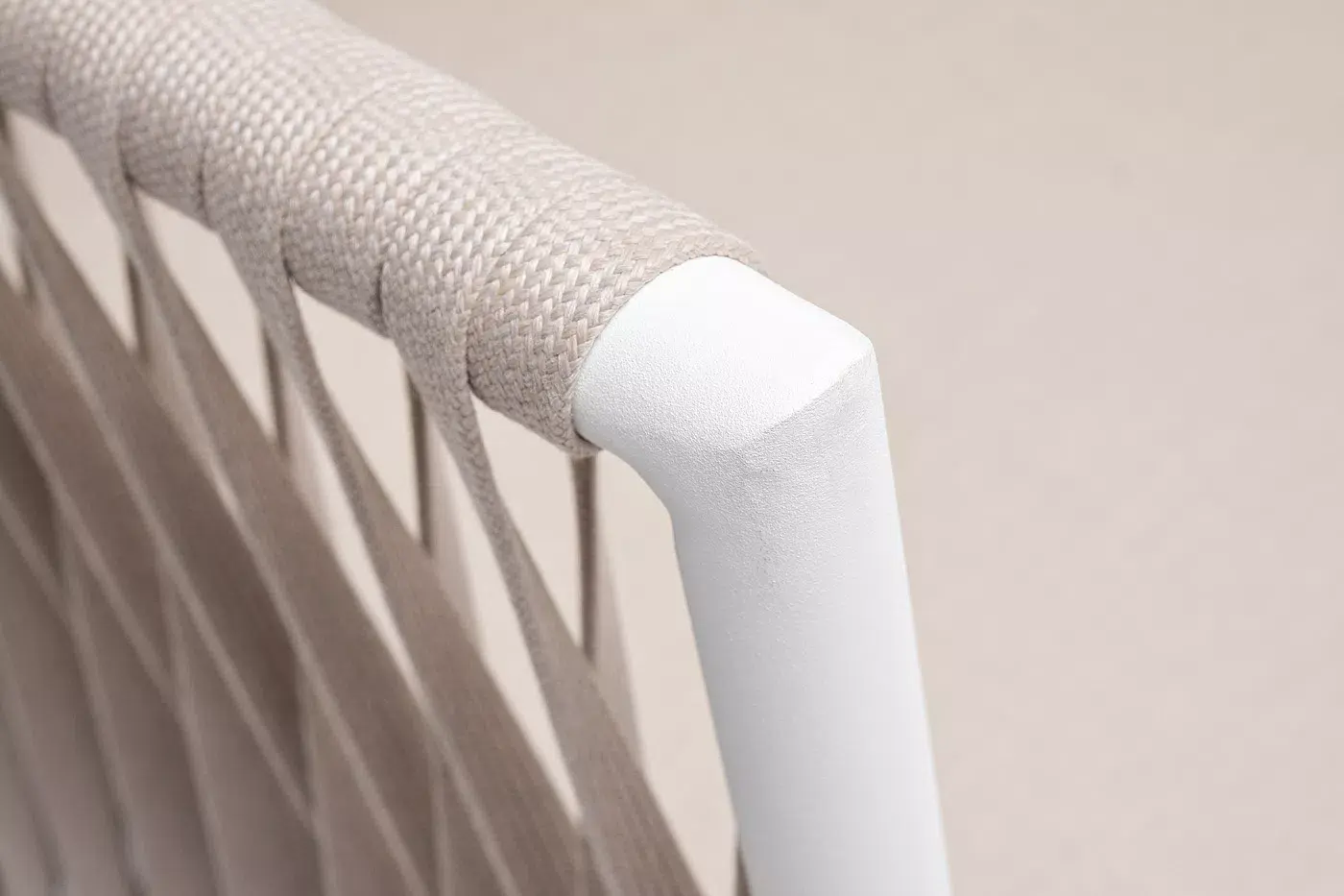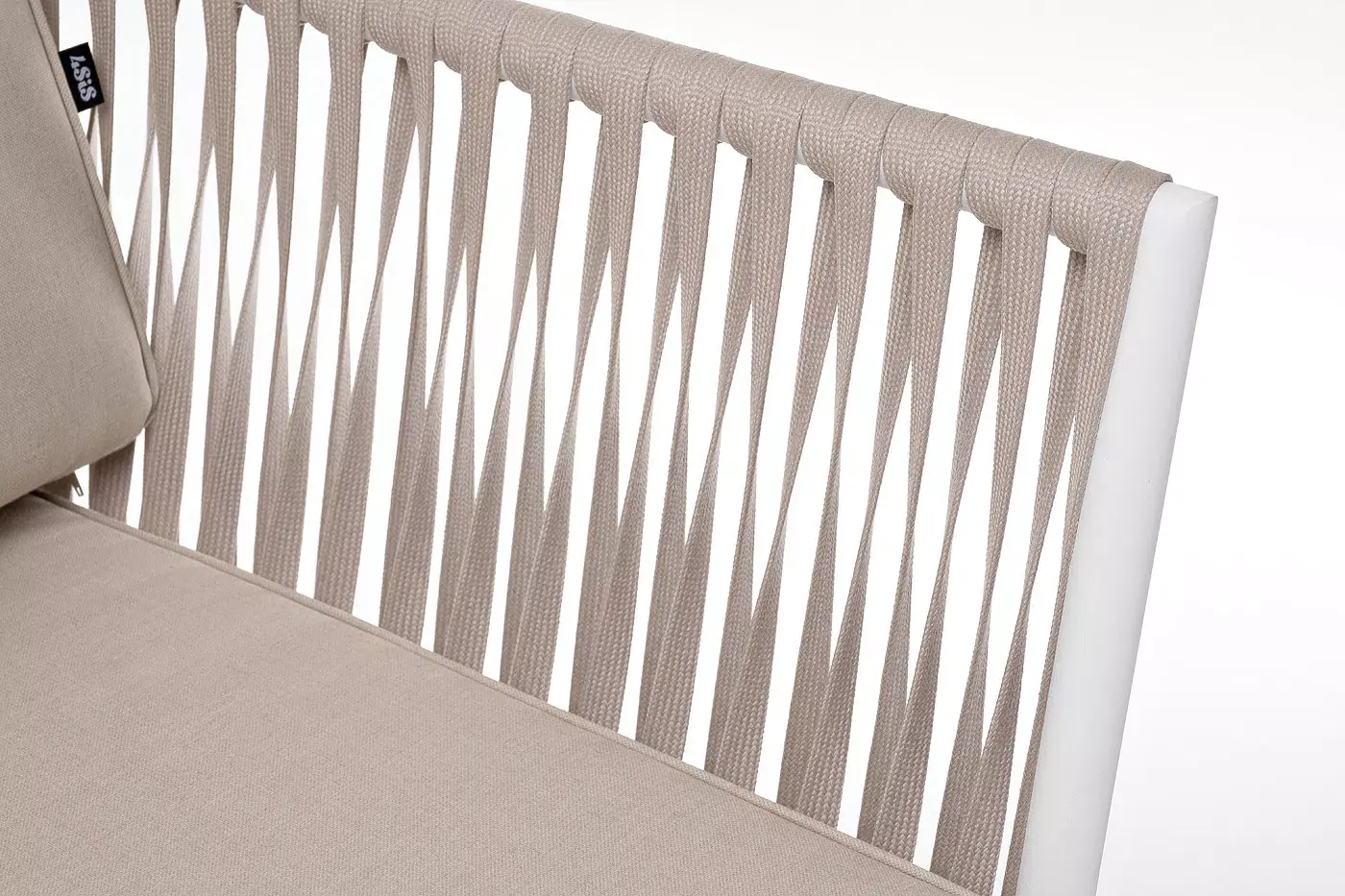 Диван имеет алюминиевый каркас, окрашенный порошковой краской в белый цвет. Боковины каркаса вручную оплетены роупом - эластичными синтетическими лентами, изготовленными из высокопрочных полиэфирных волокон. Цвет оплетки - бежевый.
