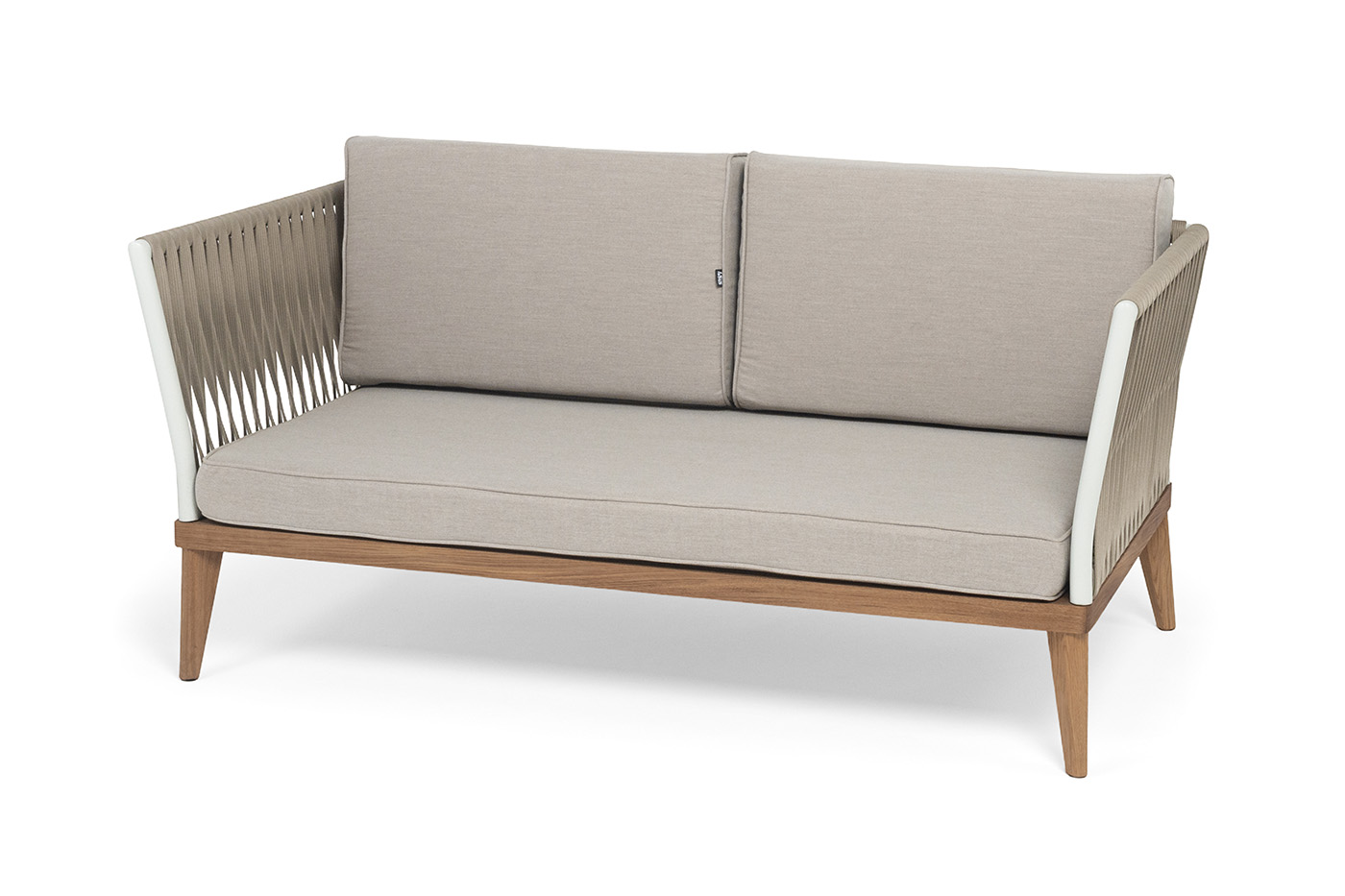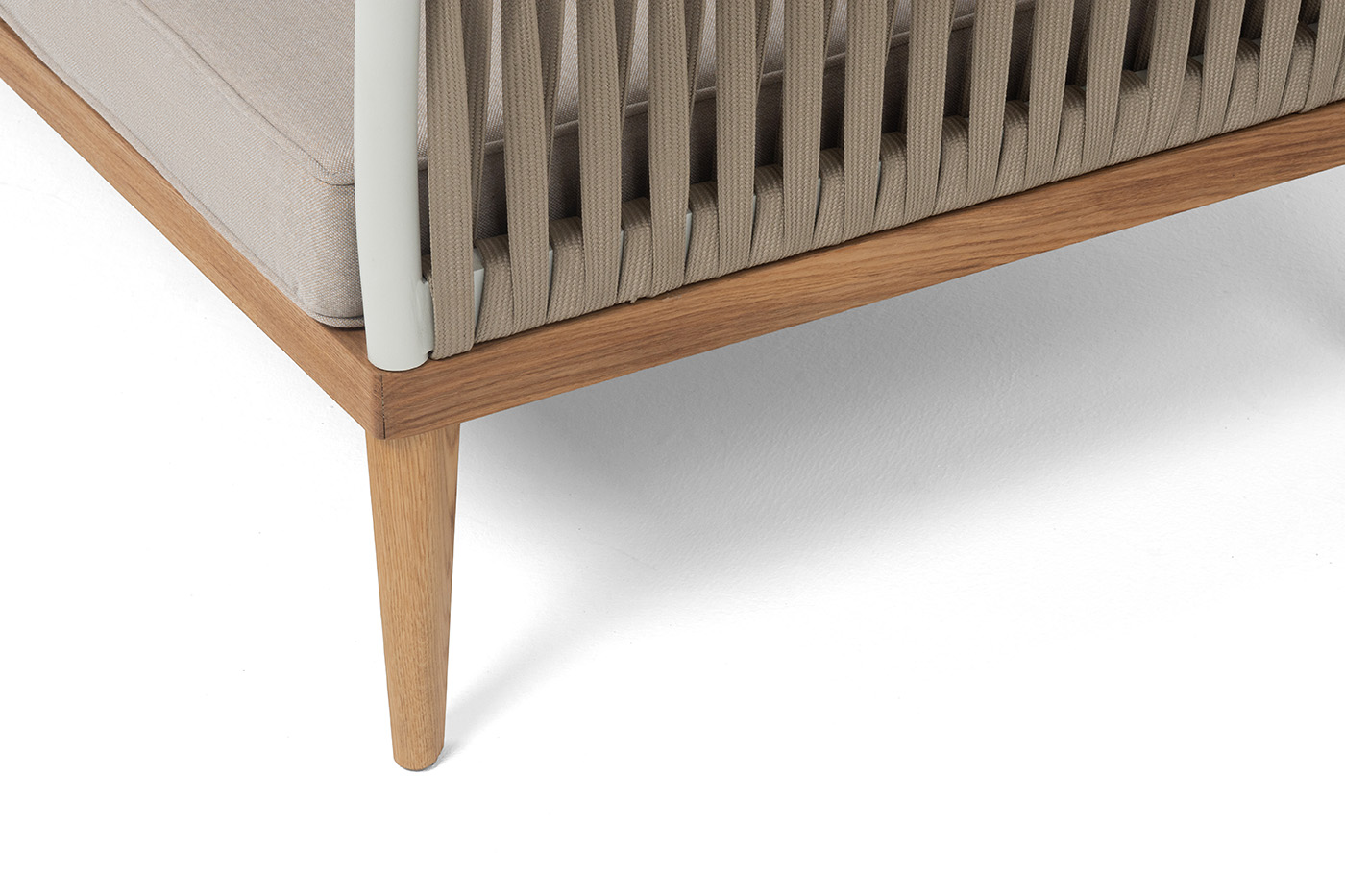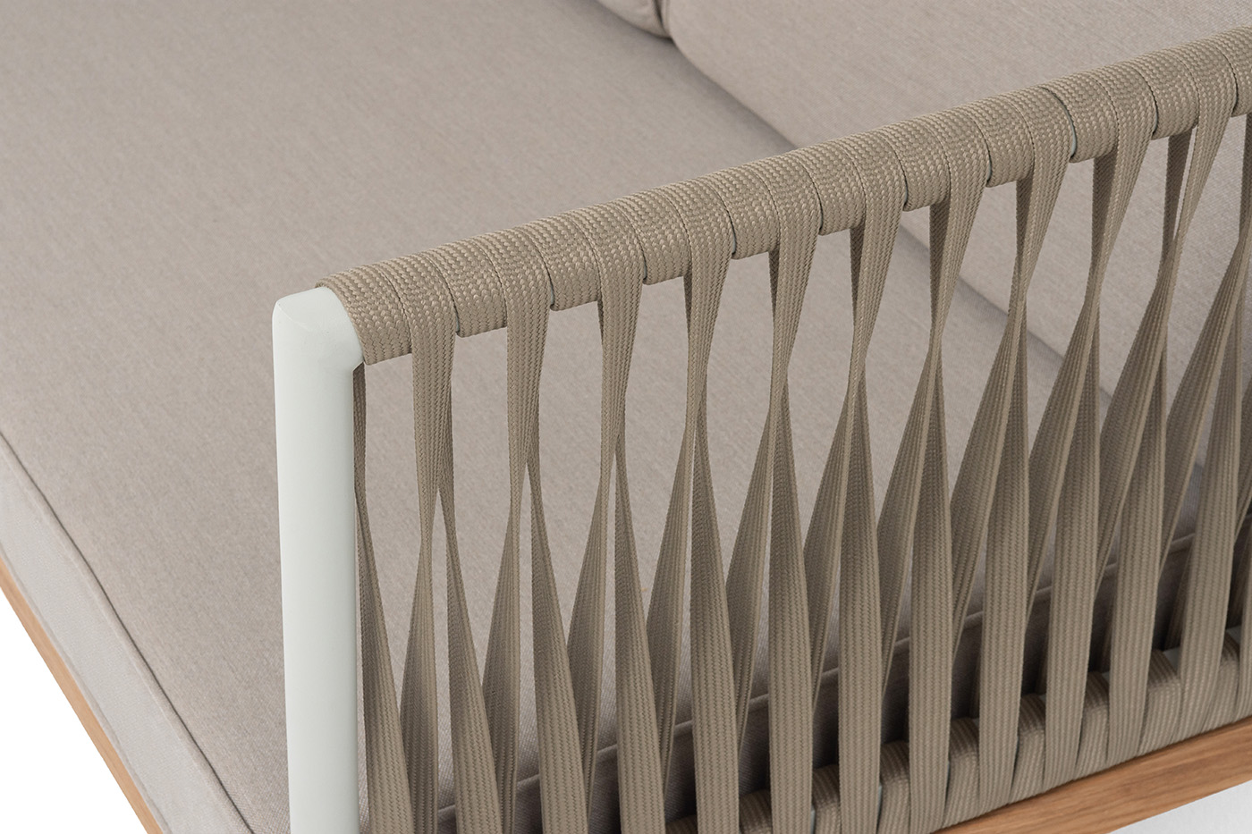 Основание дивана - дуб, каркас из алюминия светло-серого (RAL7035) цвета. Боковины каркаса вручную оплетены роупом - эластичными синтетическими лентами, изготовленными из высокопрочных полиэфирных волокон. Цвет оплетки - серо-коричневый.