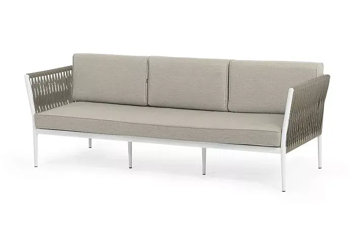 Диван имеет алюминиевый каркас, окрашенный порошковой краской в светло-серый (RAL7035) цвет. Боковины каркаса вручную оплетены роупом - эластичными синтетическими лентами, изготовленными из высокопрочных полиэфирных волокон. Цвет оплетки - серо-коричневый.