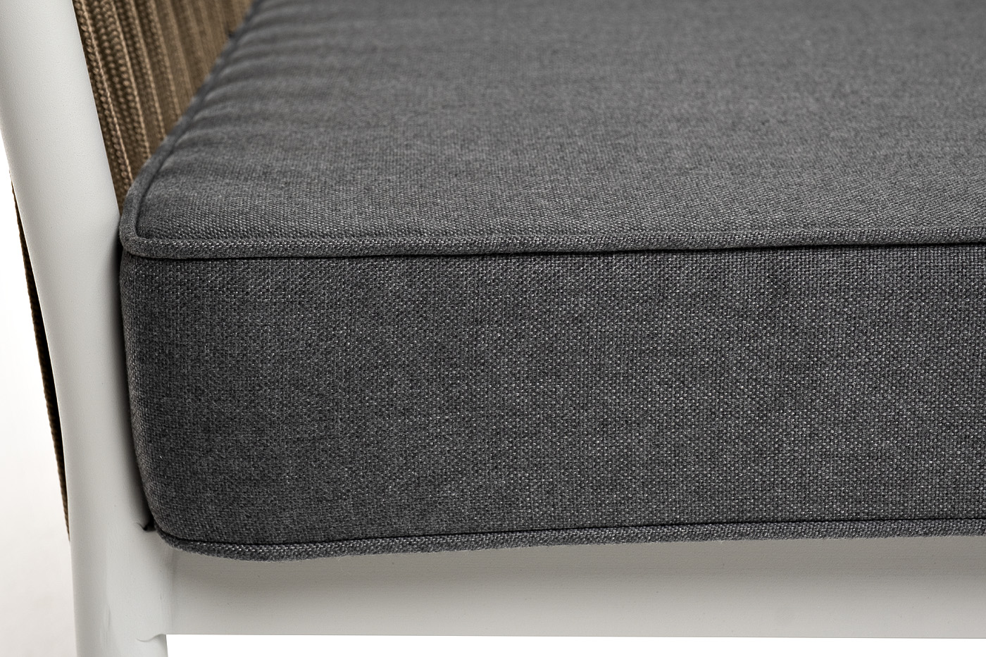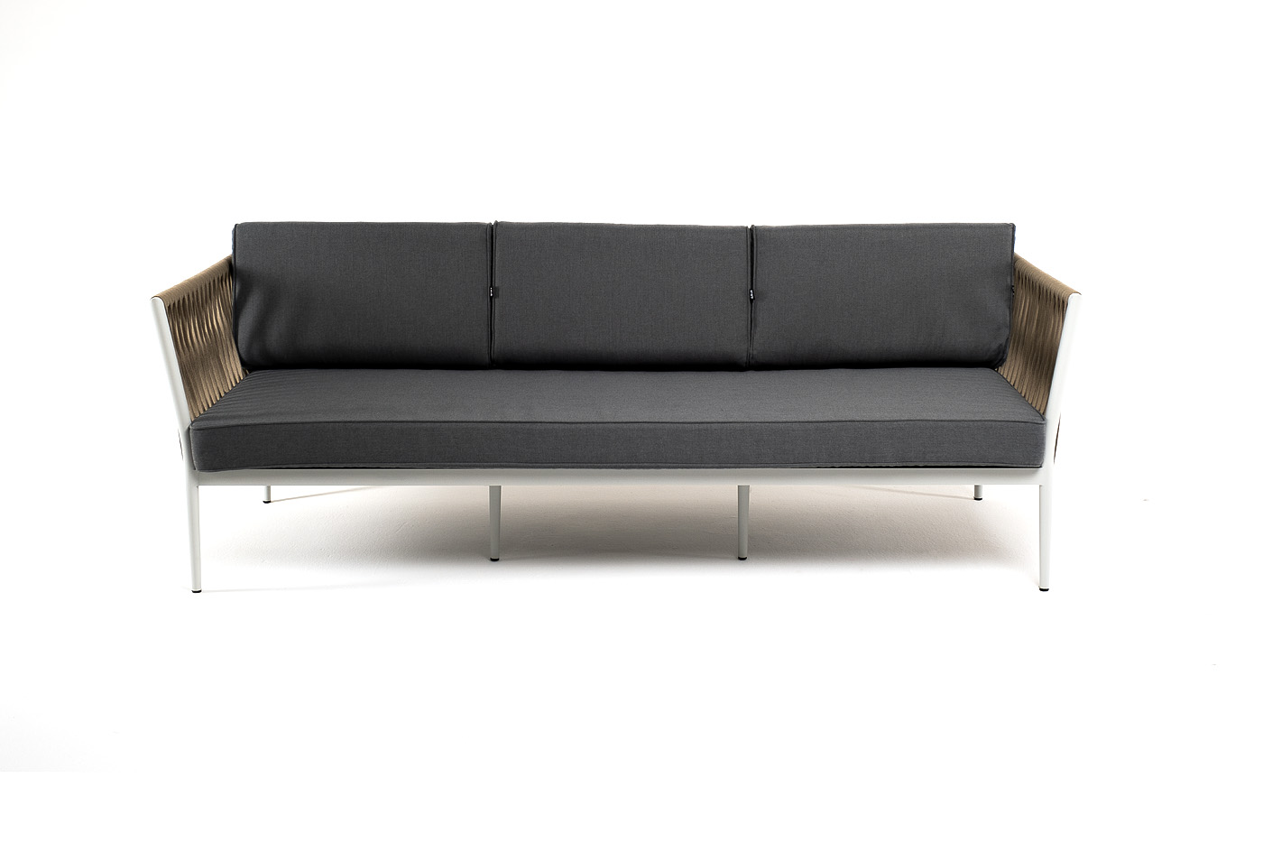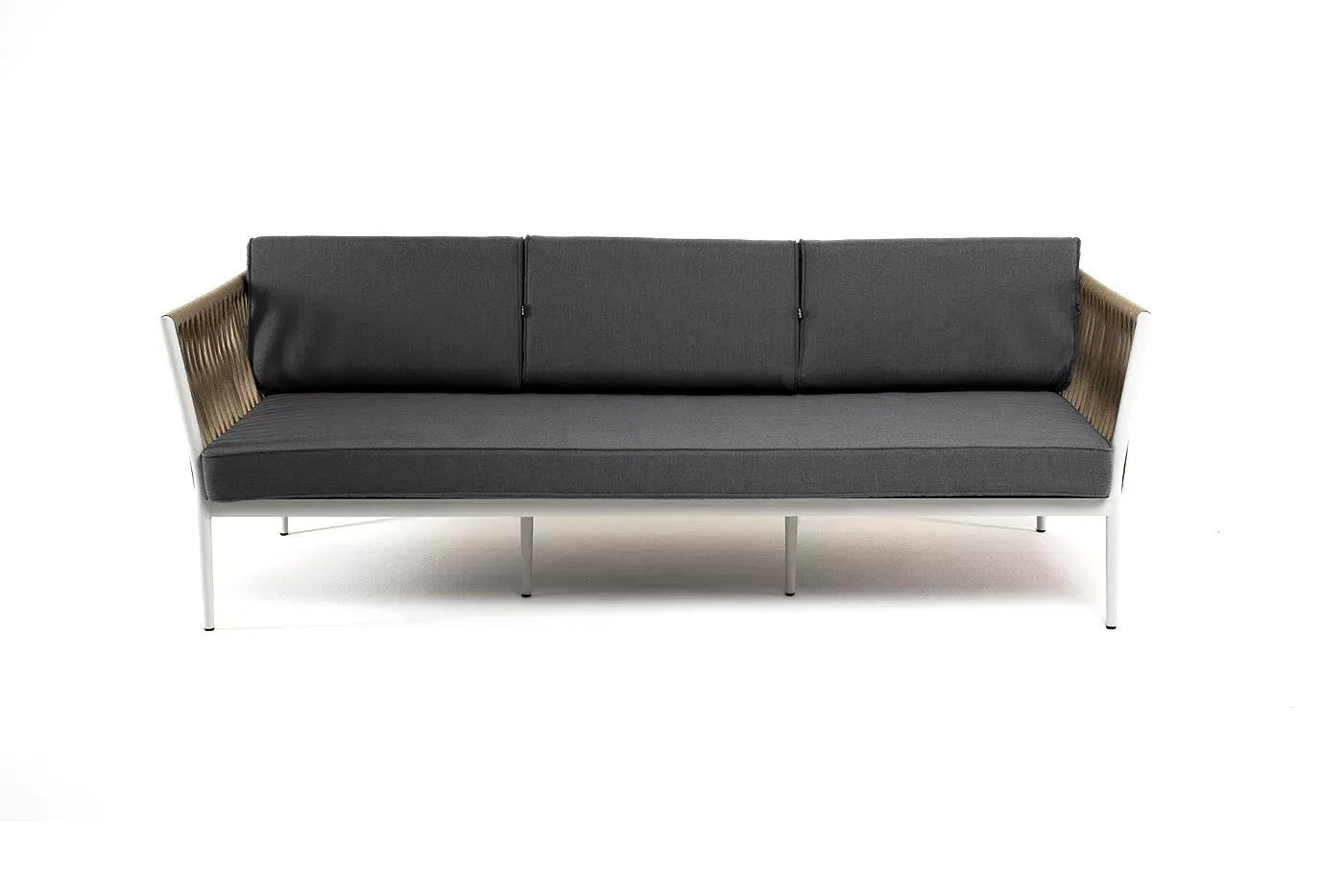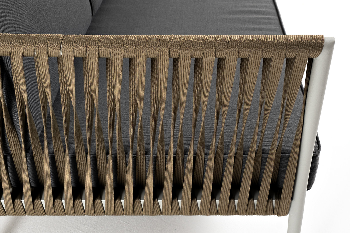 Диван имеет алюминиевый каркас, окрашенный порошковой краской в светло-серый (RAL7035) цвет. Боковины каркаса вручную оплетены роупом - эластичными синтетическими лентами, изготовленными из высокопрочных полиэфирных волокон. Цвет оплетки - серо-коричневый.