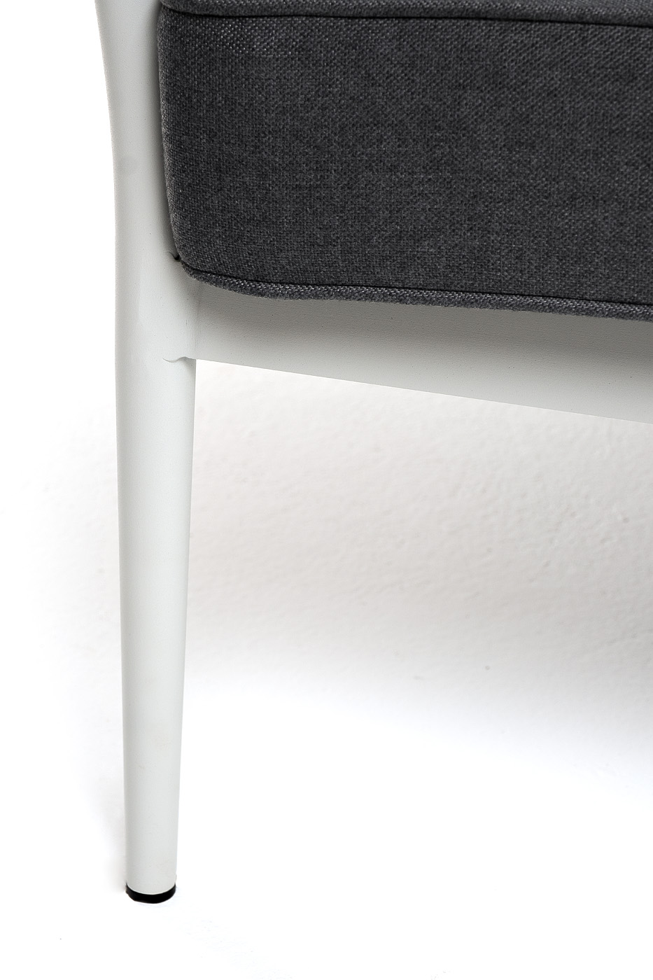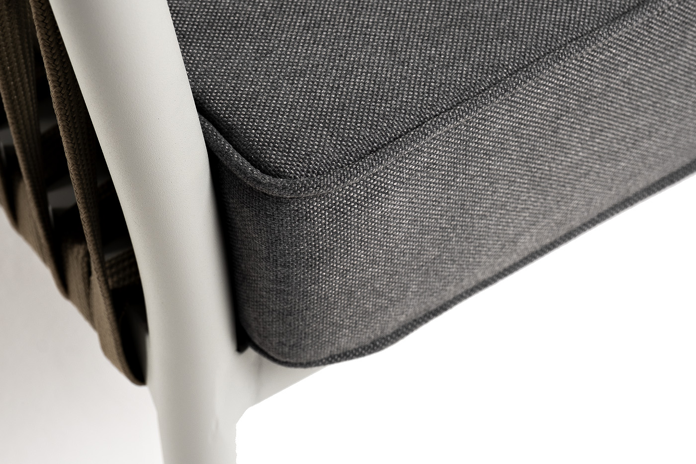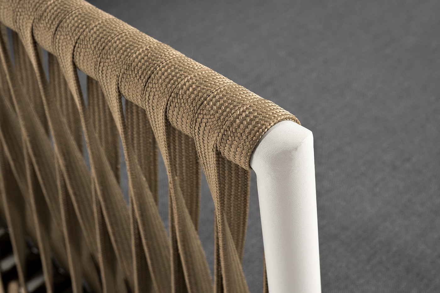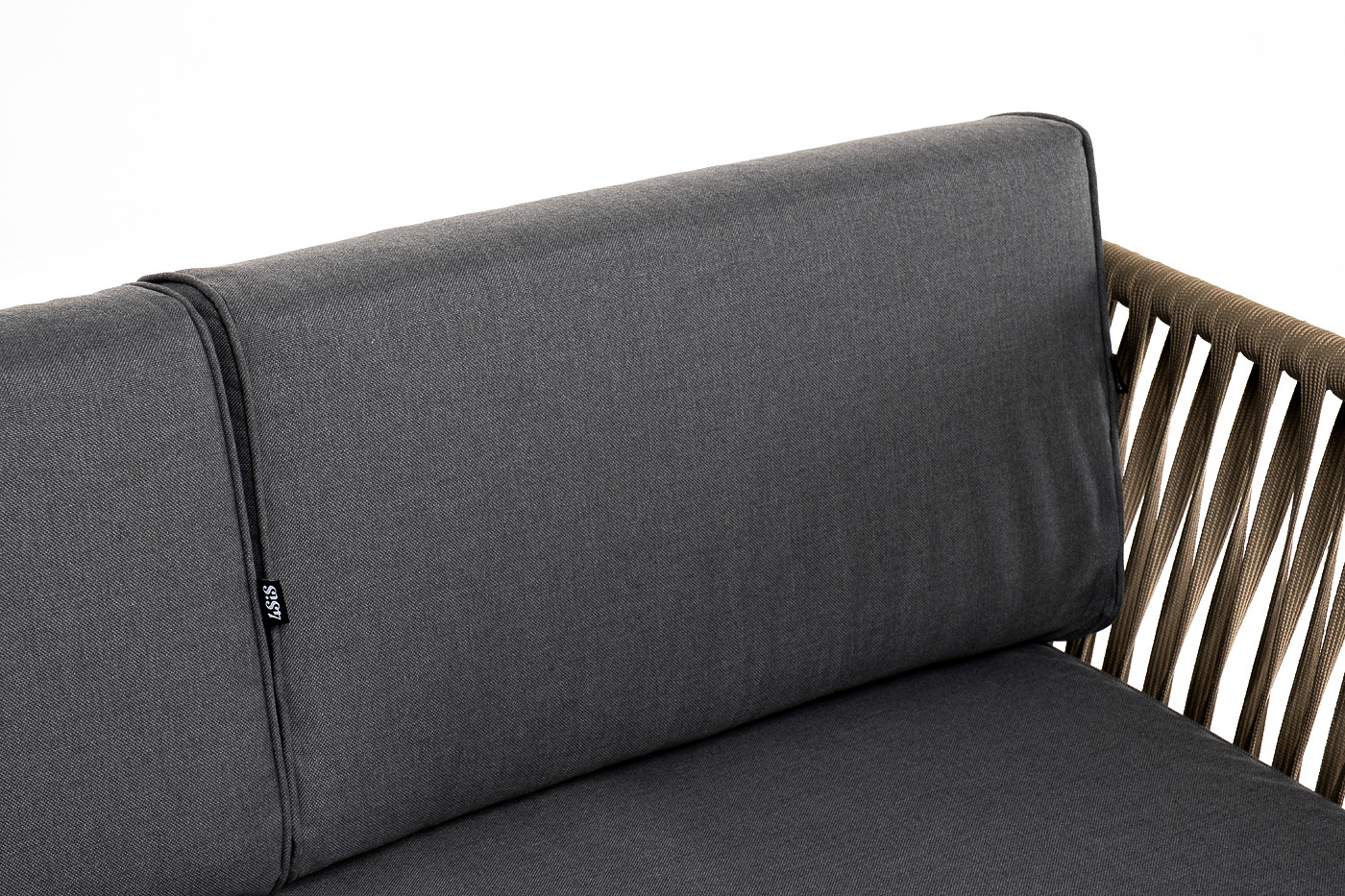 Диван имеет алюминиевый каркас, окрашенный порошковой краской в светло-серый (RAL7035) цвет. Боковины каркаса вручную оплетены роупом - эластичными синтетическими лентами, изготовленными из высокопрочных полиэфирных волокон. Цвет оплетки - серо-коричневый.