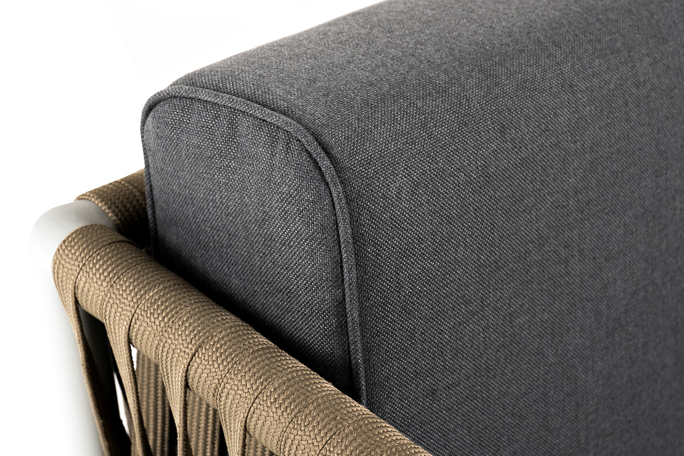 Диван имеет алюминиевый каркас, окрашенный порошковой краской в светло-серый (RAL7035) цвет. Боковины каркаса вручную оплетены роупом - эластичными синтетическими лентами, изготовленными из высокопрочных полиэфирных волокон. Цвет оплетки - серо-коричневый.