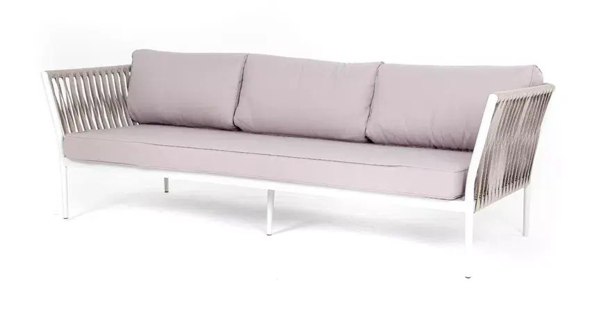 Диван имеет алюминиевый каркас, окрашенный порошковой краской в светло-серый (RAL7035) цвет. Боковины каркаса вручную оплетены роупом - эластичными синтетическими лентами, изготовленными из высокопрочных полиэфирных волокон. Цвет оплетки - серо-коричневый.