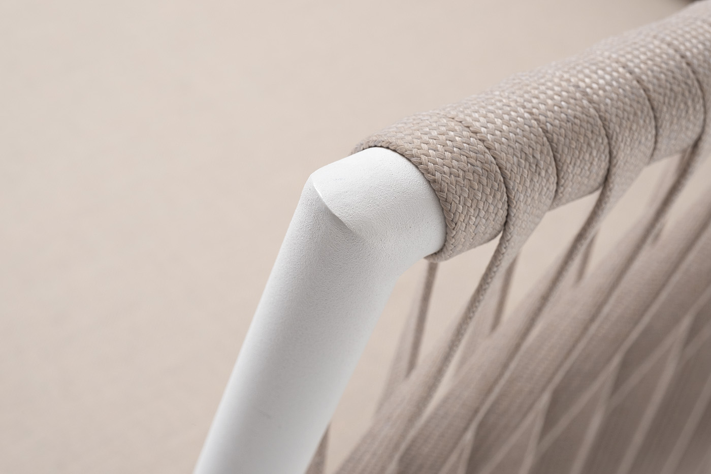 Кресло имеет алюминиевый каркас, окрашенный порошковой краской белового цвет. Боковины каркаса вручную оплетены роупом - эластичными синтетическими лентами, изготовленными из высокопрочных полиэфирных волокон. Цвет оплетки - бежевый.