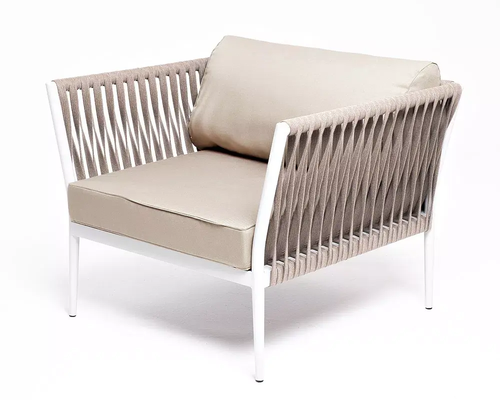 "Касабланка" кресло плетеное из роупа, каркас алюминий светло-серый (RAL7035) муар, роуп серо-коричневый 23мм, ткань бежевая 052