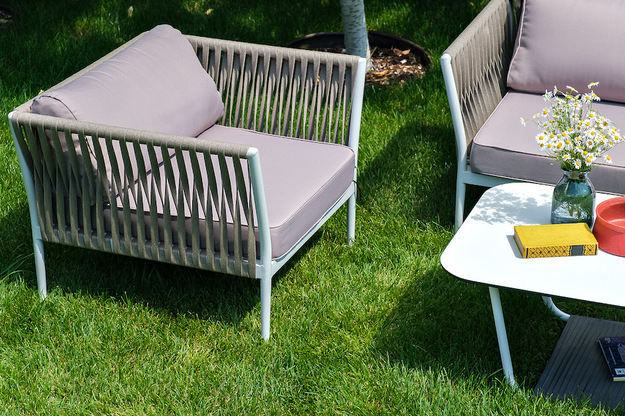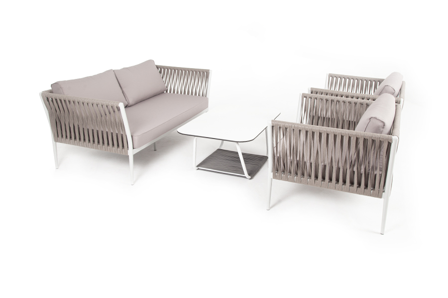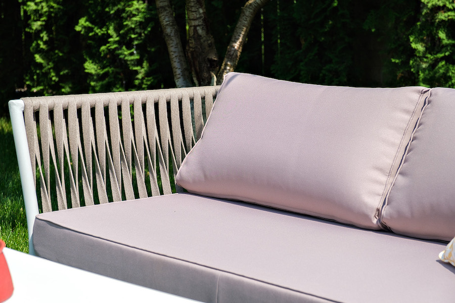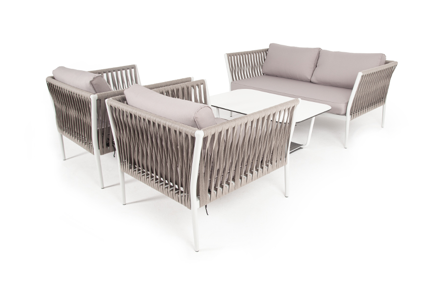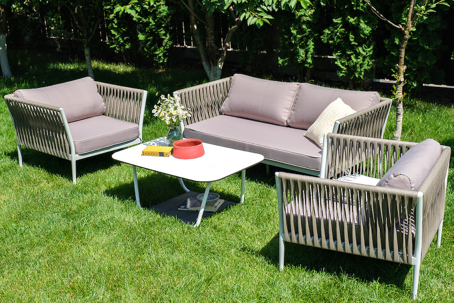 Диван и кресла изготовлены их алюминиевого прочного каркаса, оплетенного ручным способом роупом серо-коричневого цвета. Это эластичные ленты из полиэфирных волокон высокого качества.