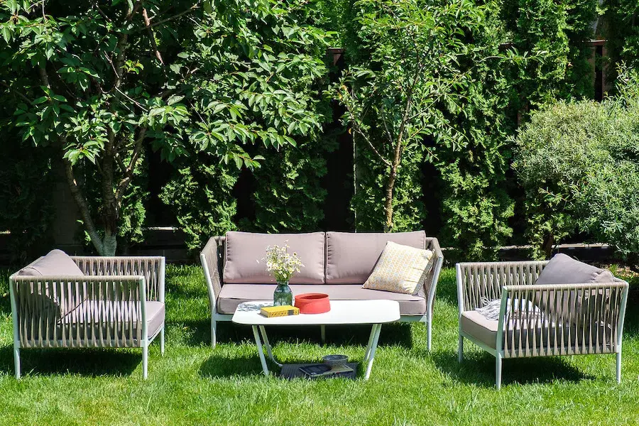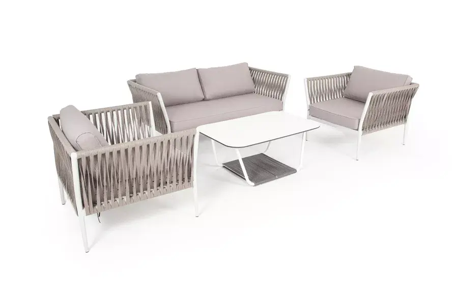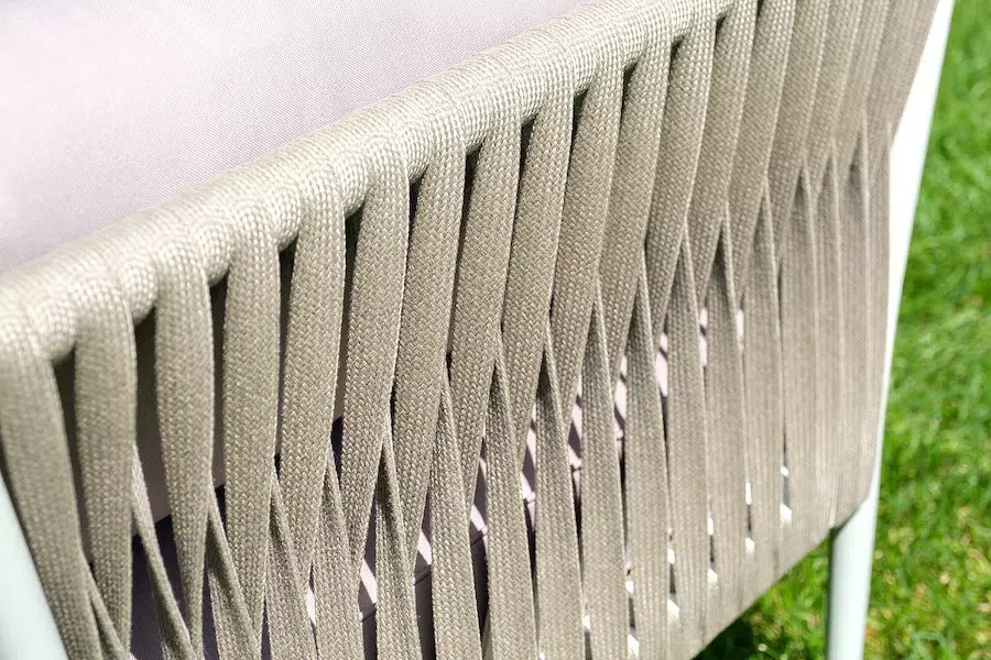 Диван и кресла изготовлены их алюминиевого прочного каркаса, оплетенного ручным способом роупом серо-коричневого цвета. Это эластичные ленты из полиэфирных волокон высокого качества.