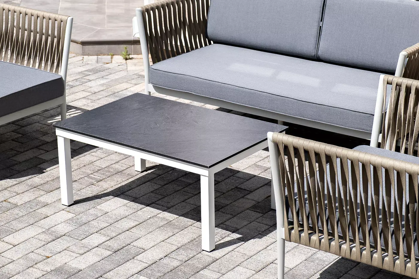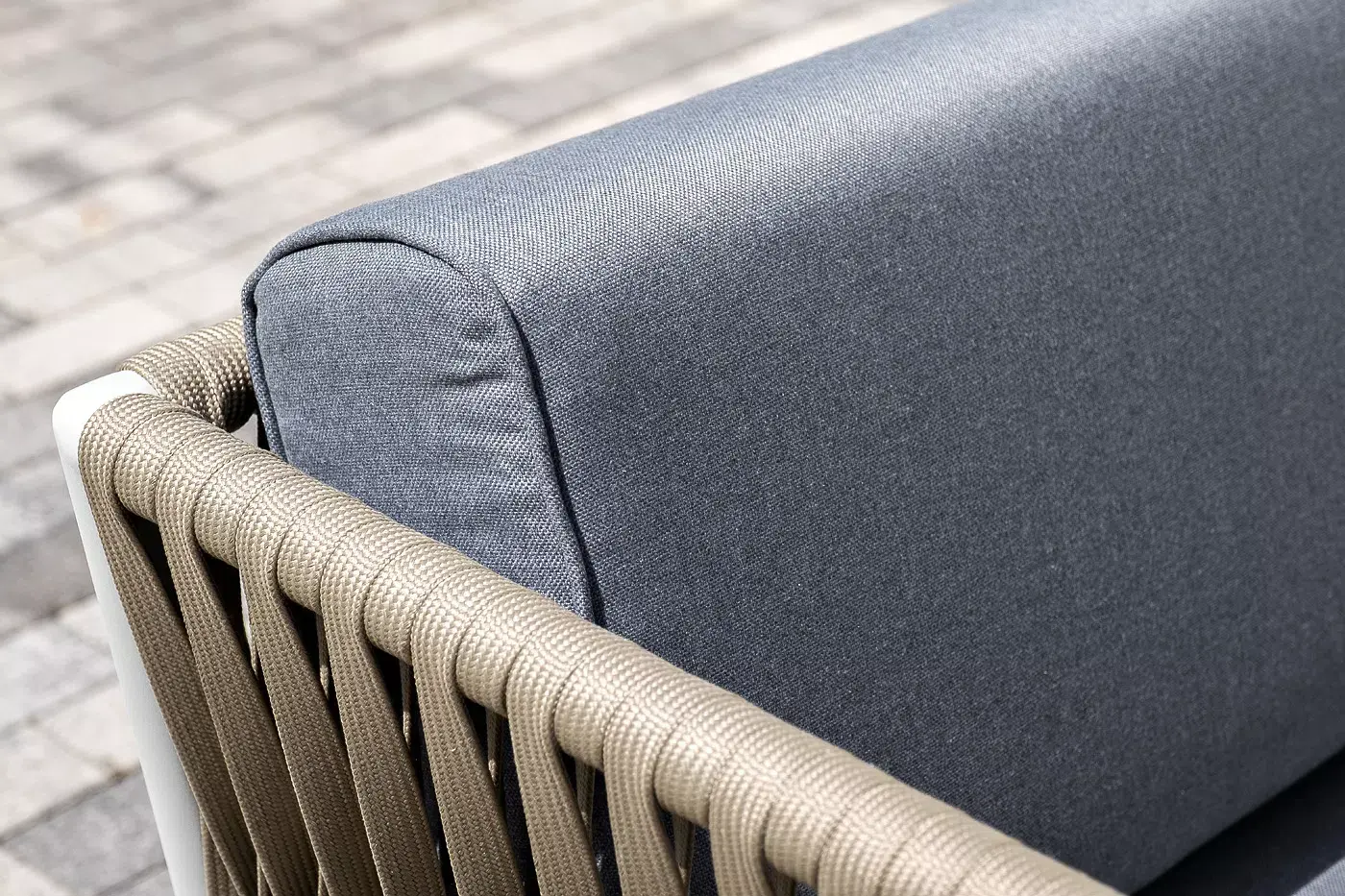 Диван и кресла изготовлены их алюминиевого прочного каркаса, оплетенного ручным способом роупом серо-коричневого цвета. Это эластичные ленты из полиэфирных волокон высокого качества.
