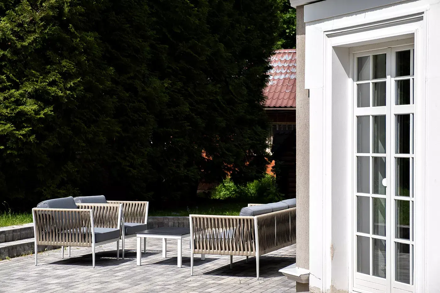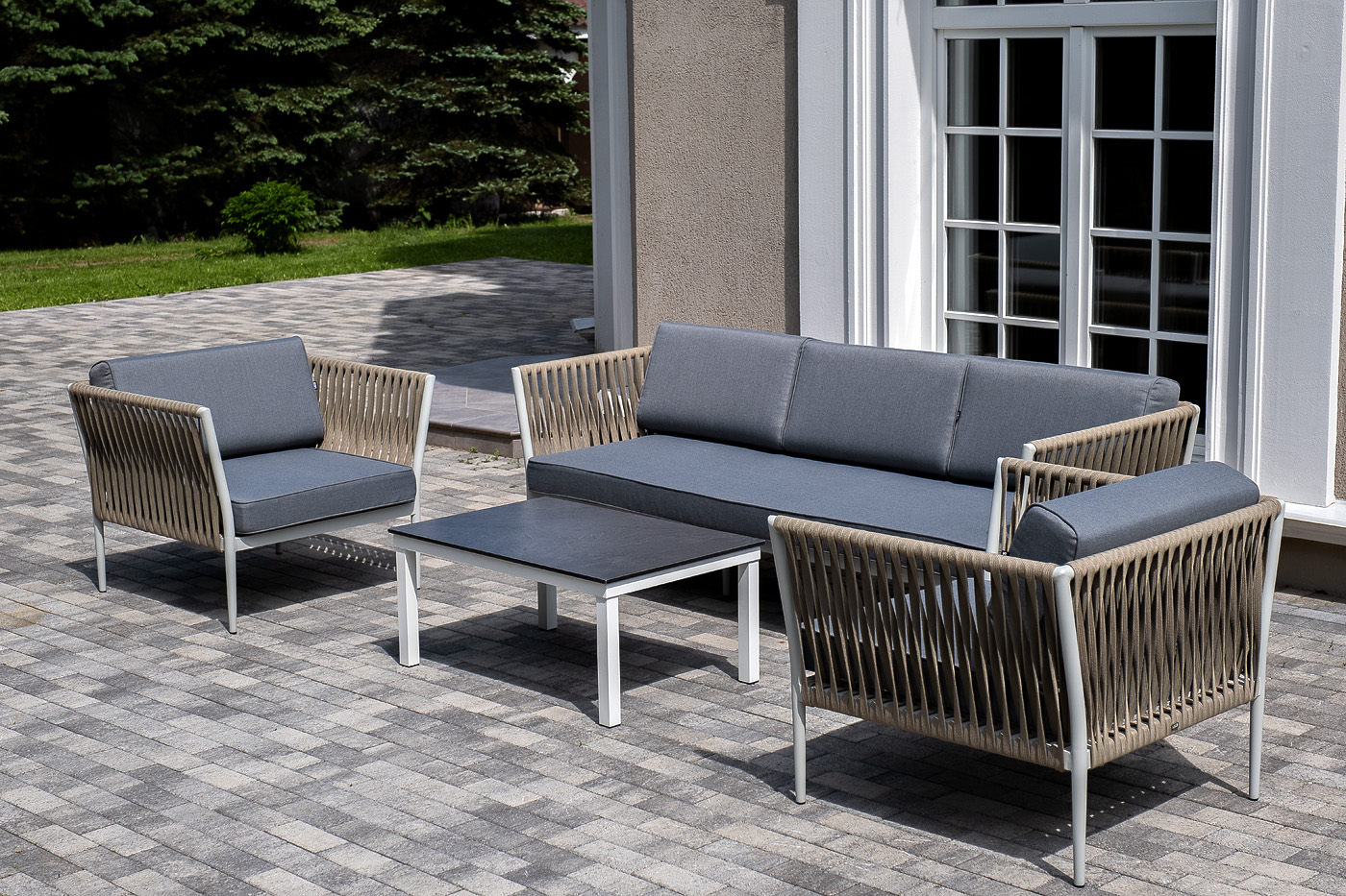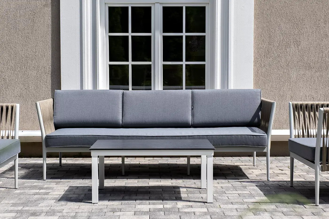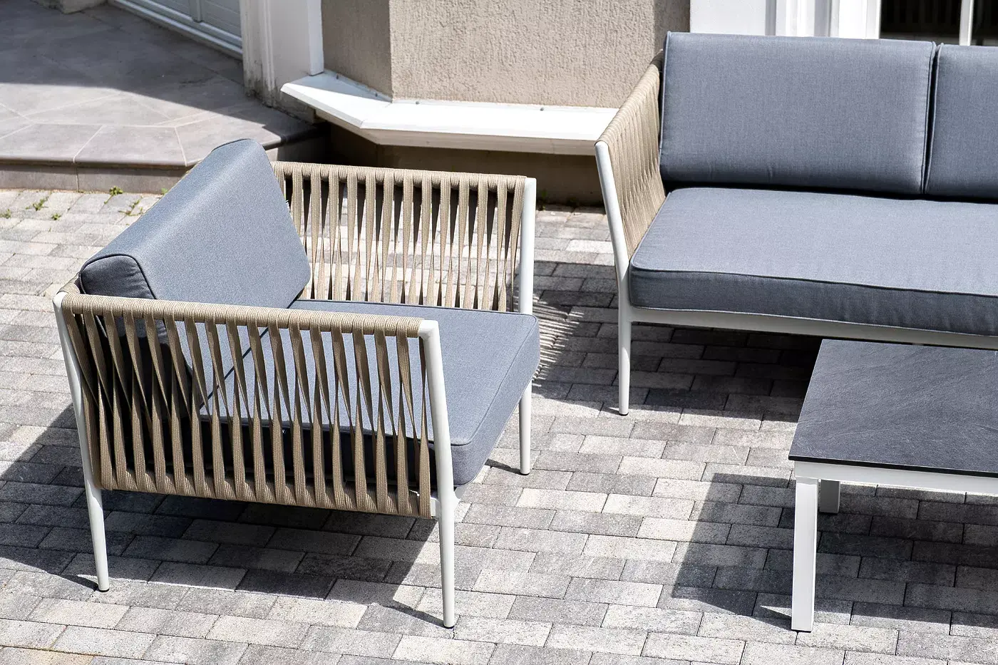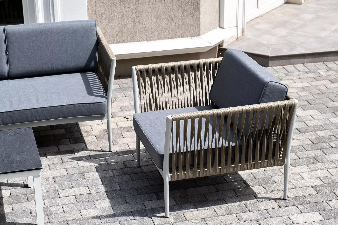Диван и кресла изготовлены их алюминиевого прочного каркаса, оплетенного ручным способом роупом серо-коричневого цвета. Это эластичные ленты из полиэфирных волокон высокого качества.