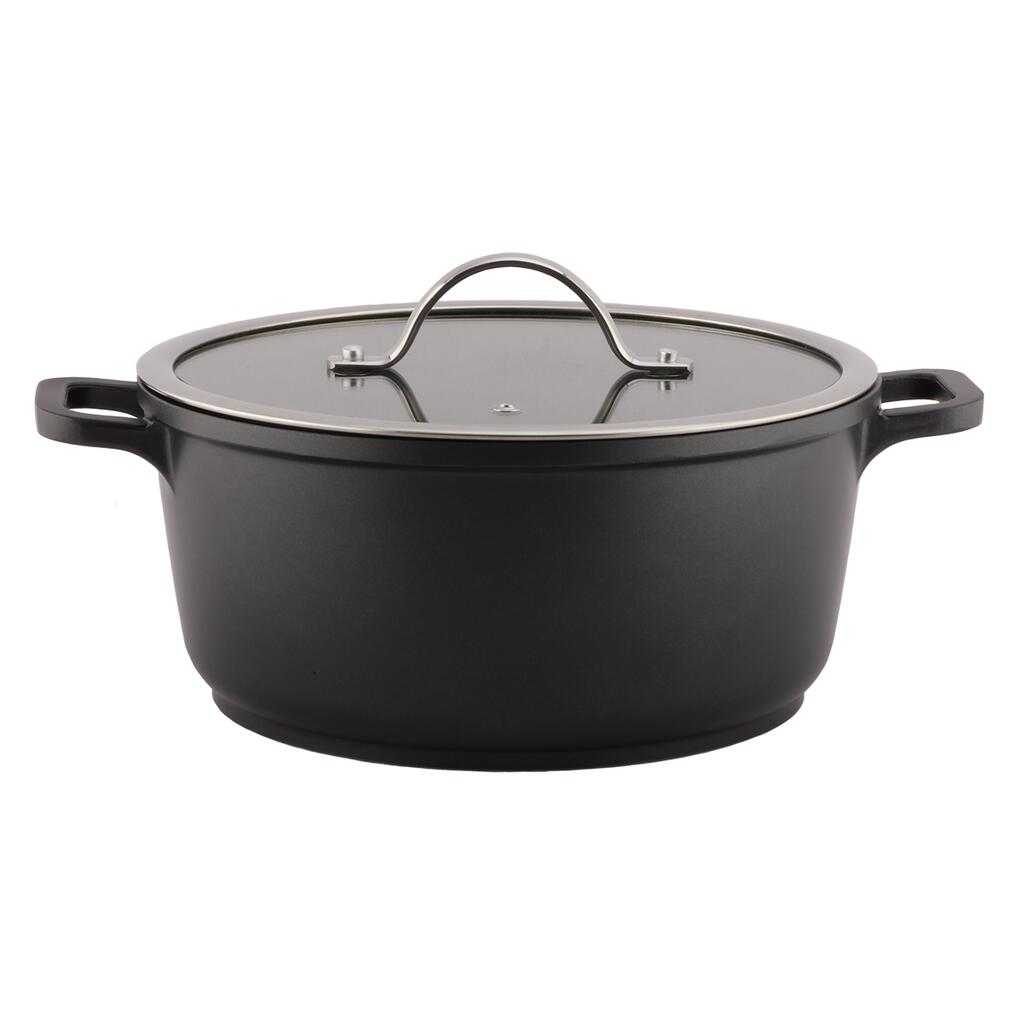 Литой алюминий с антипригарным покрытием. Диаметр дна 20,8 см, Длина с ручками 32,2 см, высота кастрюли без крышки 11 см.