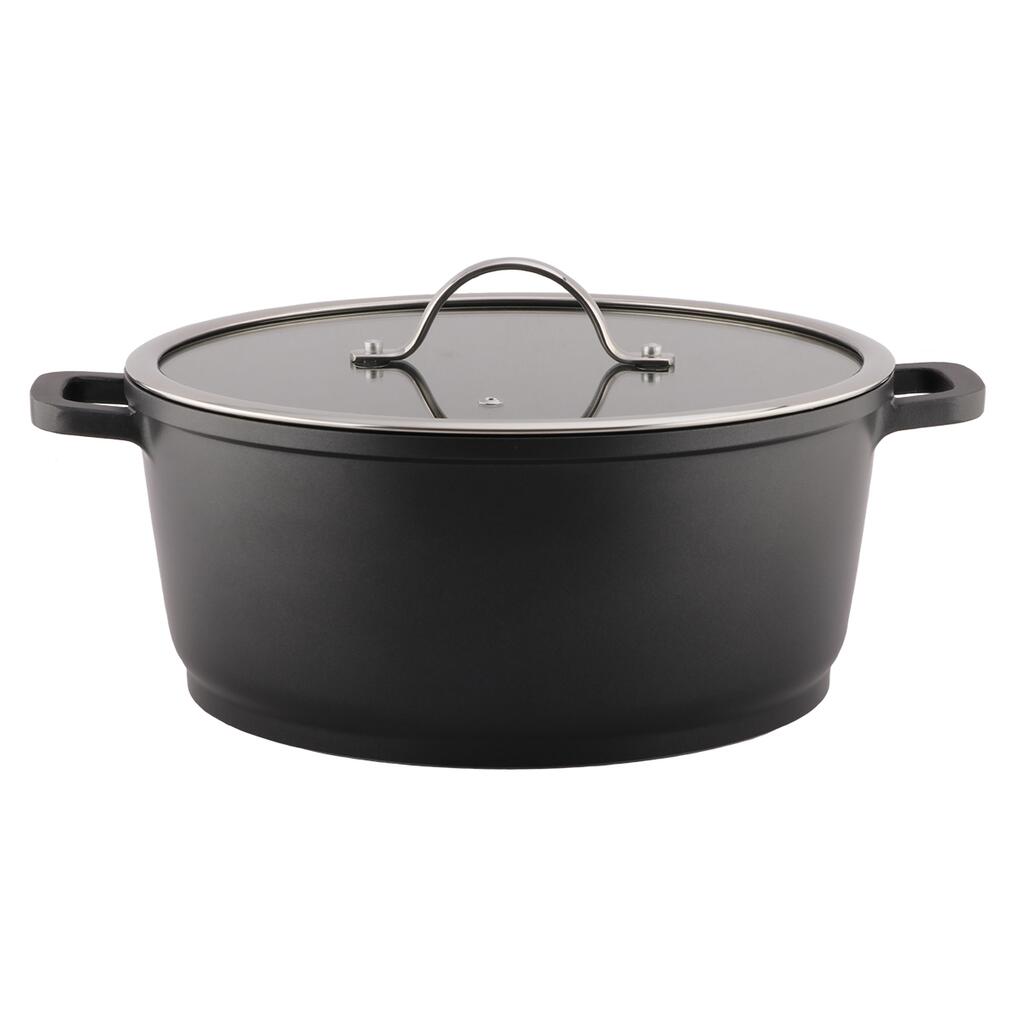 Литой алюминий с антипригарным покрытием. Диаметр дна 24,8 см, Длина с ручками 36,2 см, высота кастрюли без крышки 12,5 см.