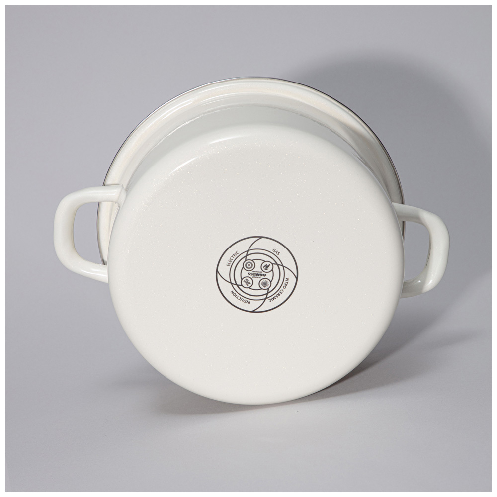 Толщина корпуса без эмалированного покрытия 0,7мм. 3-х слойное эмалированное покрытие - грунтовое, базовое и финишное покрытие с глиттером. Подходит для всех типов плит, включая индукционные. Можно мыть в посудомоечной машине.