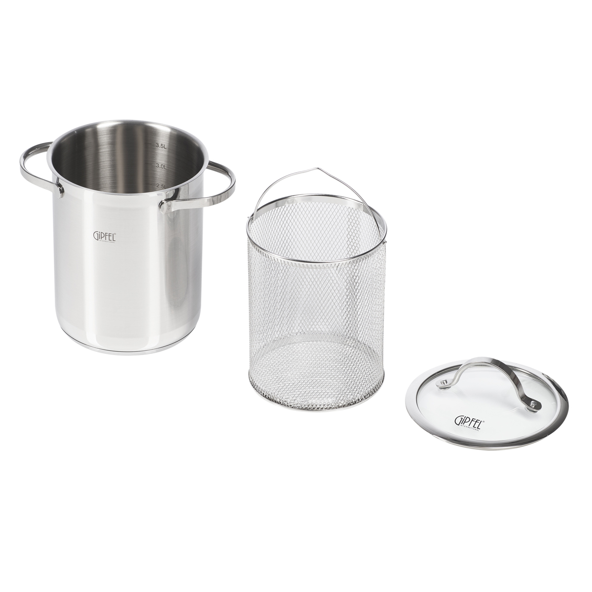 Кастрюля для варки овощей Gipfel Victory 1303. Изготовлена из нержавеющей стали 18/10. Диаметр 16 см, высота 20 см, высота с крышкой 27 см. Объем 4 л. Толщина стенок 0,6 мм. На внутреннюю стенку нанесена мерная шкала до 3,5 л.