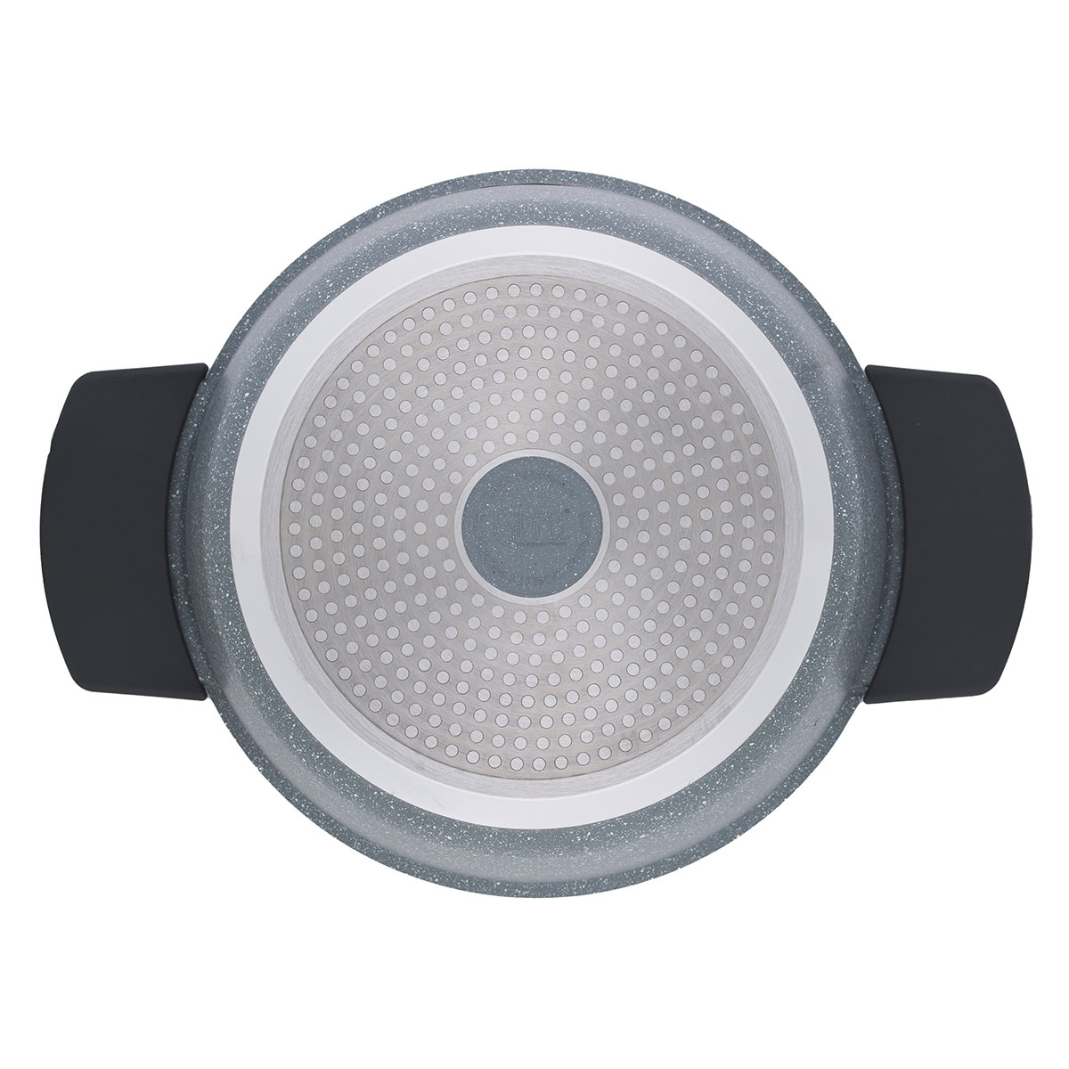 Вся посуда серии GREYCE имеет отделку внутренней стороны корпуса из литого алюминия в черном цвете, а наружная изготовлена в цвете серого мрамора. Каждая модель серии оснащена антипригарным покрытием Ilag Ultimate, индукционным дном и ручками с силиконовым покрытием, объем данной кастрюли составляет 6,5 литра.