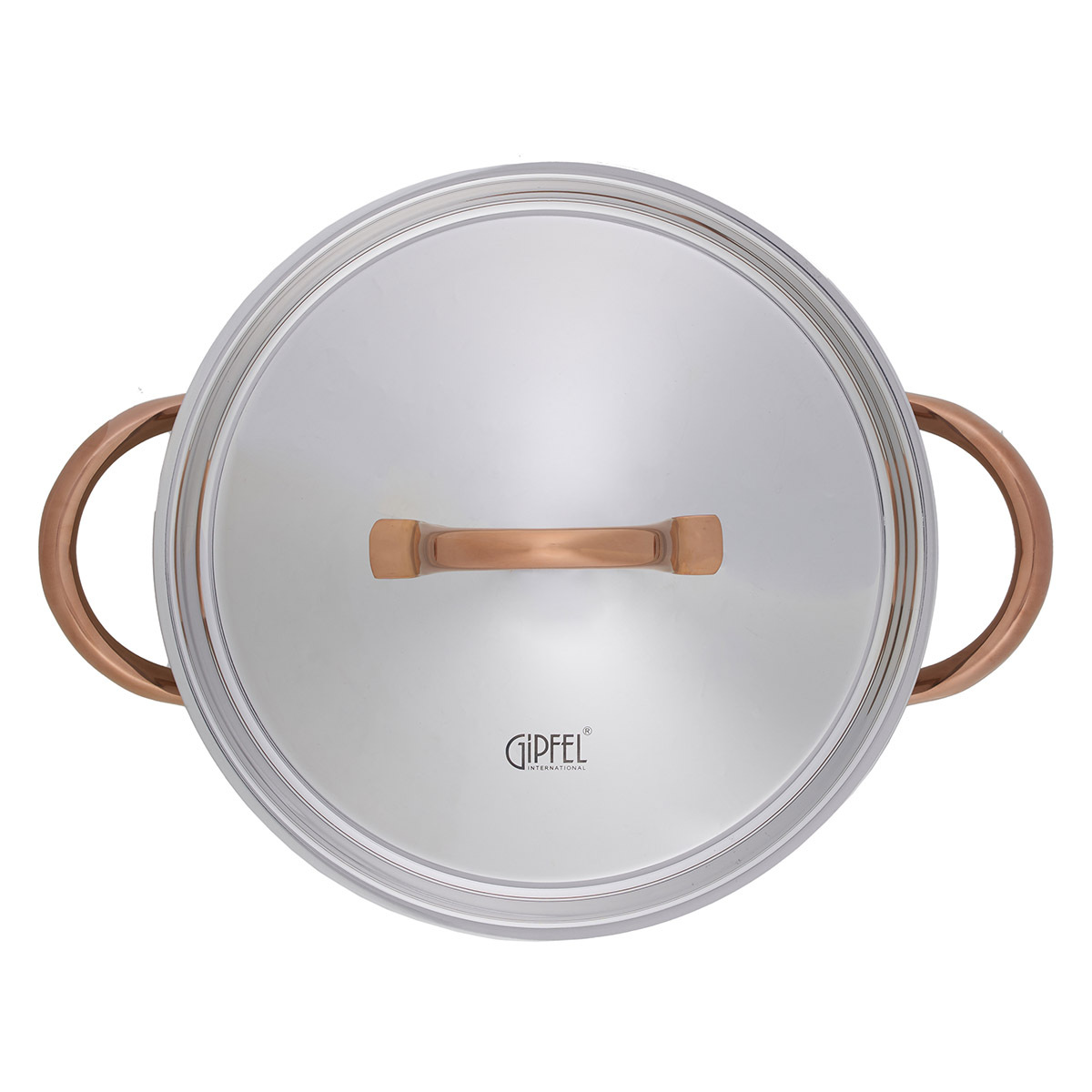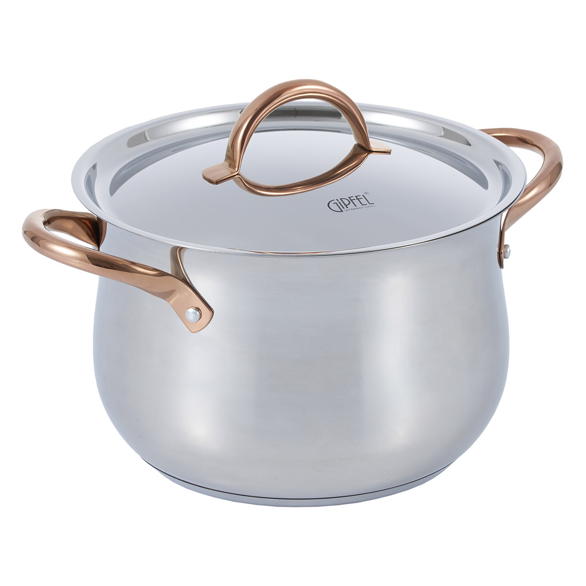 Кастрюля Gipfel ABSOLUTE 2755. Размер 24х17 см, объем 7,7 л. Кастрюля укомплектована стальной крышкой. С индукционным капсульным дном. Сделана из нержавеющей стали 18/10. Толщина стенок 0,8 мм. Толщина дна 3 мм. Упакована в фирменную коробку с ручкой.