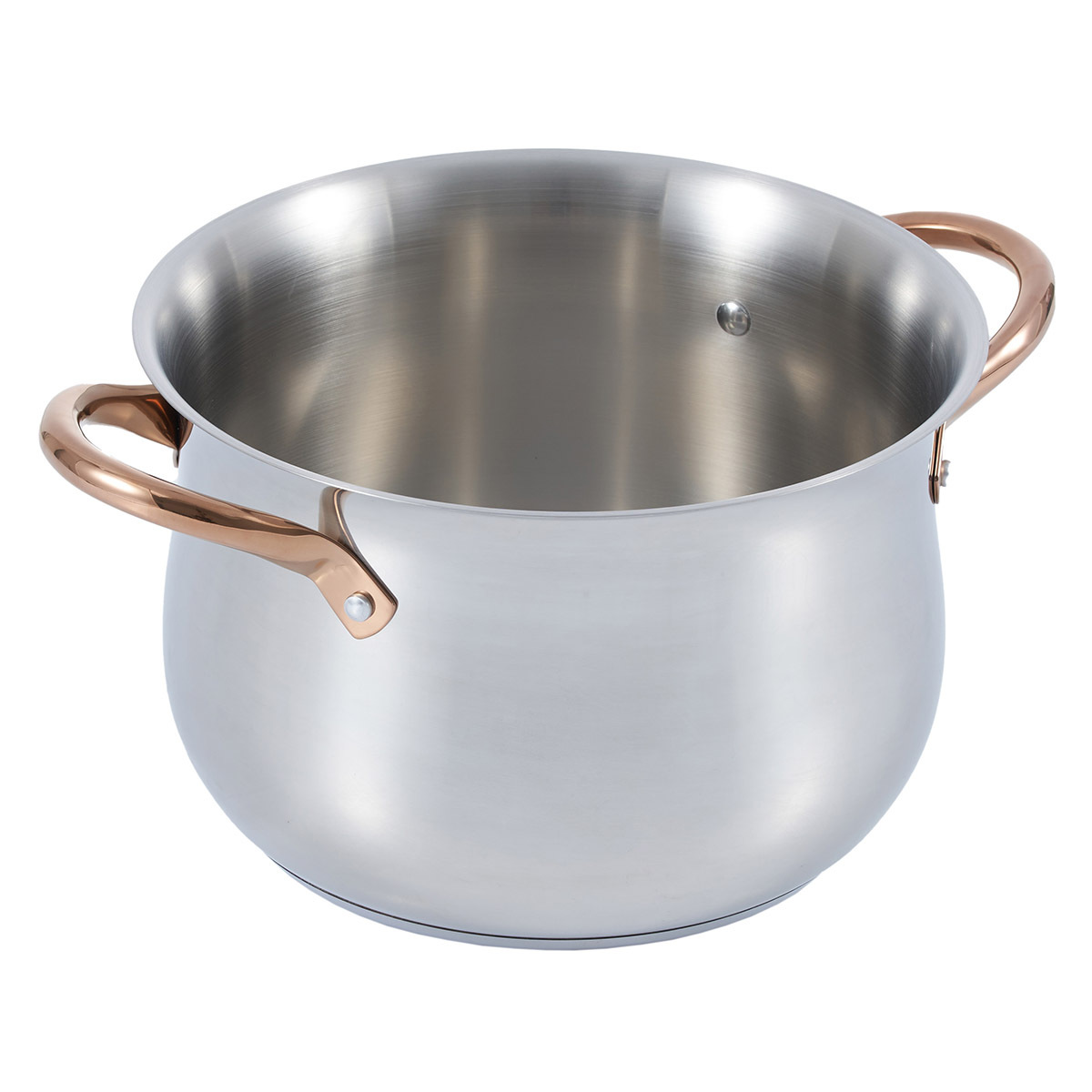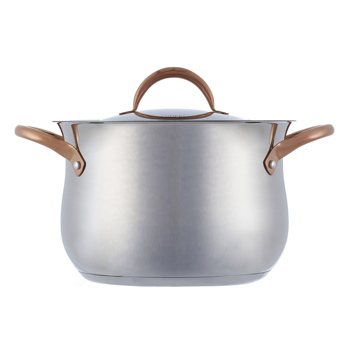 Вся серия посуды ABSOLUTE изготовлена из высококачественной медицинской стали марки 18/10. Она обладает повышенными антидеформационными свойствами и не боится высоких температур, в ней можно смело хранить пищу после приготовления. Также стоит отметить капсульное дно в посуде ABSOLUTE – между нержавейкой расположен слой алюминия, который обеспечивает быстрый и равномерный нагрев посуды при готовке. Толщина корпуса составляет 0,8 мм, а объем кастрюли – 7,7 литра. Рабочий объем кастрюли 7 литров. В комплект входит стальная крышка.