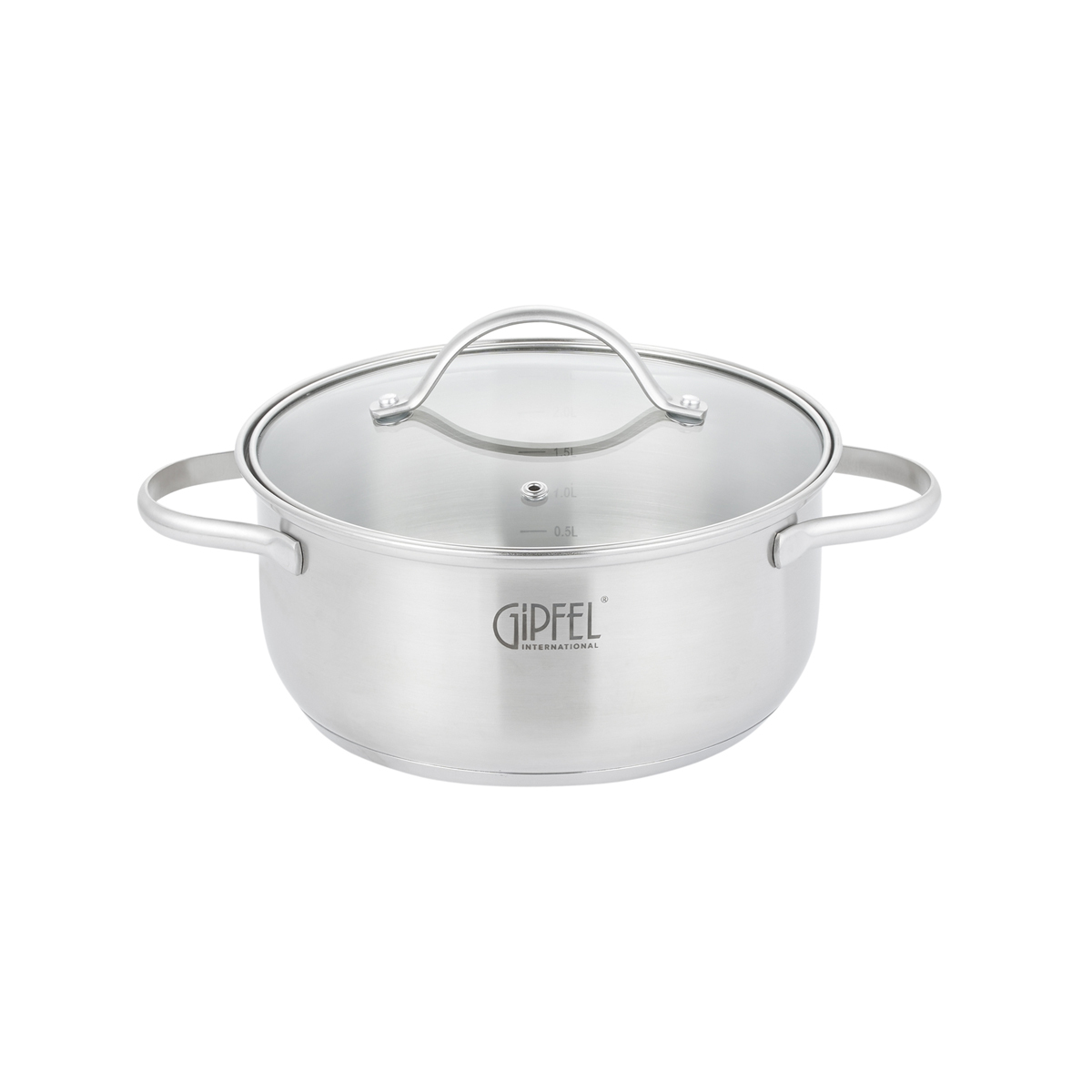 Кастрюля Gipfel AZALEA 51060 20x9.5 см/ 2.3л со стеклянной крышкой. Подходит для всех видов плит, включая индукционные. Материал: нержавеющая сталь 18/10. Толщина стенок 0.5 мм.