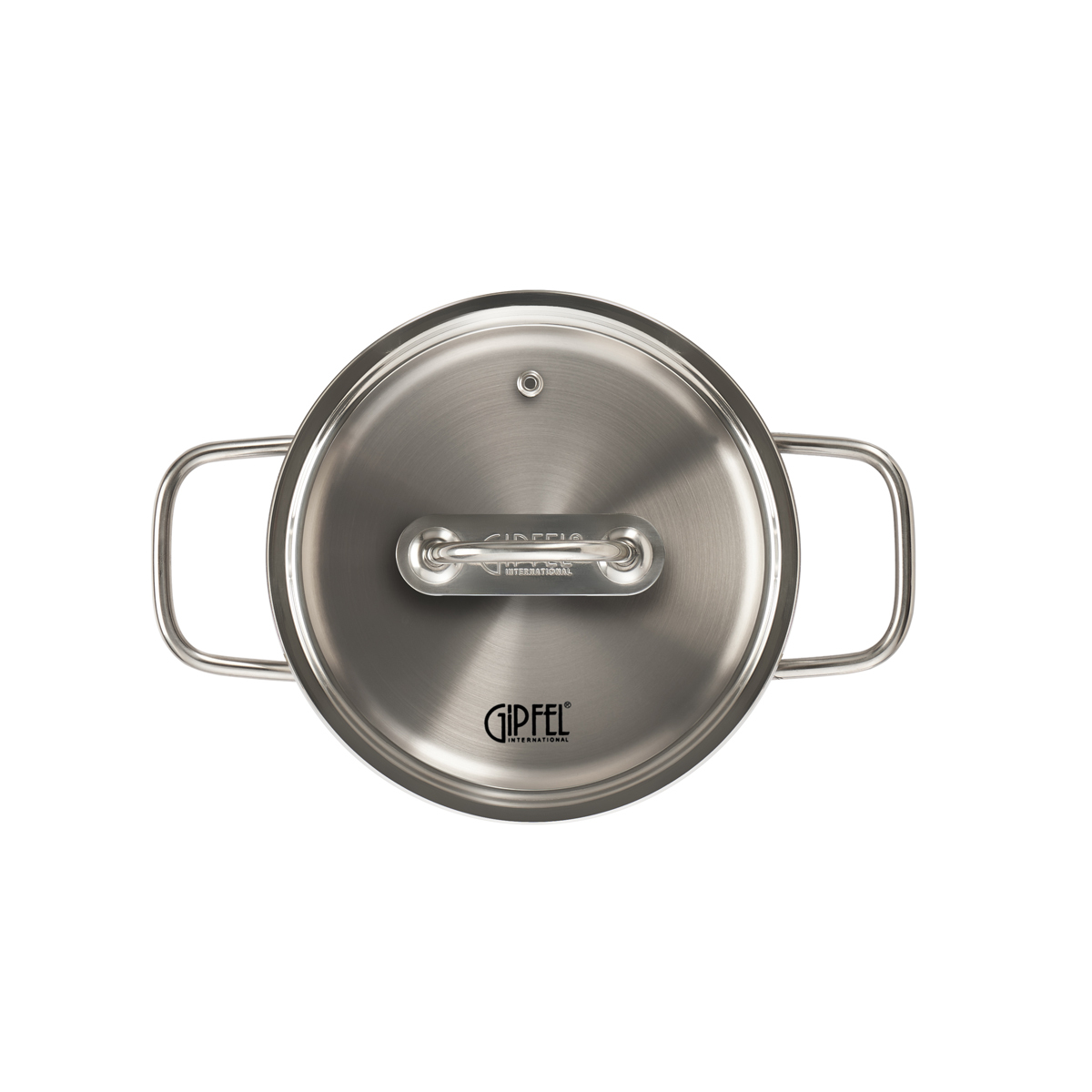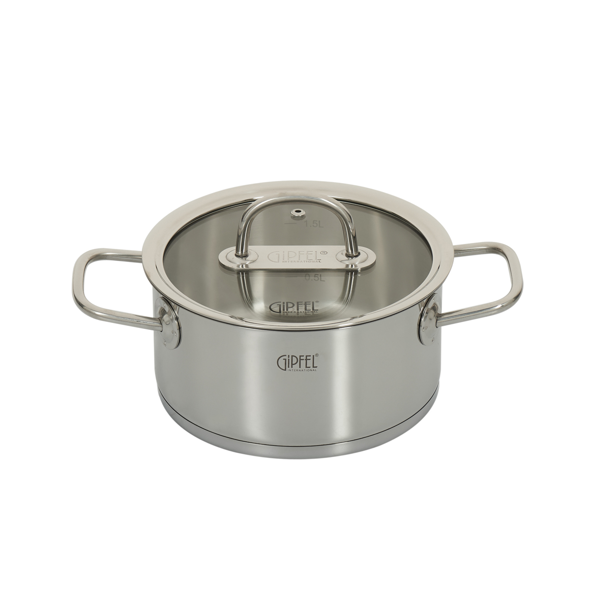 Кастрюля Gipfel Capella 2697 18х9 см. Вся посуда серии Capella имеет многослойное капсульное дно – между слоями нержавеющей стали располагается слой алюминия, благодаря чему обеспечивается равномерный и относительно быстрый нагрев посуды при готовке. Корпус посуды изготовлен из нержавеющей стали марки 18/10, которая полностью безопасна для человека и отличается повышенными антидеформационными свойствами. Всю посуду из серии Capella можно использовать на индукционных плитах. В комплект входит стеклянная крышка. Внутри имеется шкала с шагом 0,5 литра.