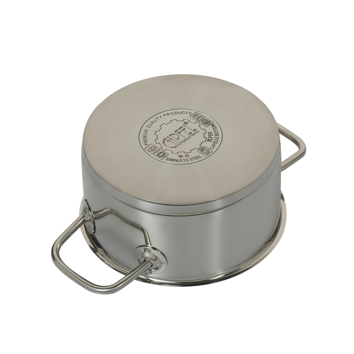Кастрюля GIPFEL CAPELLA 2697 18х9 см. Вся посуда серии CAPELLA имеет многослойное капсульное дно – между слоями нержавеющей стали располагается слой алюминия, благодаря чему обеспечивается равномерный и относительно быстрый нагрев посуды при готовке. Корпус посуды изготовлен из нержавеющей стали марки 18/10, которая полностью безопасна для человека и отличается повышенными антидеформационными свойствами. Всю посуду из серии CAPELLA можно использовать на индукционных плитах. Внутри имеется шкала с шагом 0,5 литра. Диаметр дна 17,5 см.