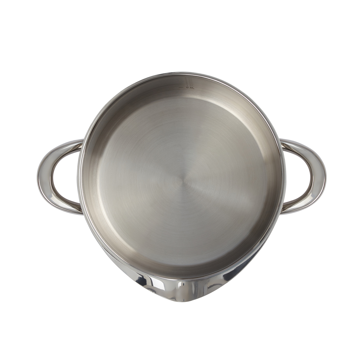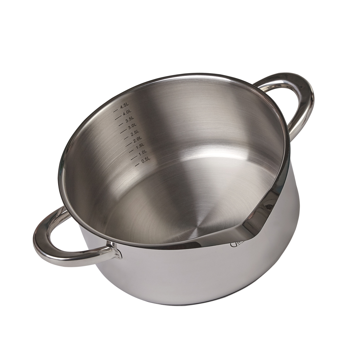 Кастрюля Gipfel Cocktail 1249 изготовлена из нержавеющей стали марки 18/10, отличающейся повышенными антикоррозийными свойствами, экологичностью и непритязательностью в уходе. Объем кастрюли 4,5 л. На внутреннюю стенку нанесена мерная шкала до 4,5 л с шагом 0,5 л.