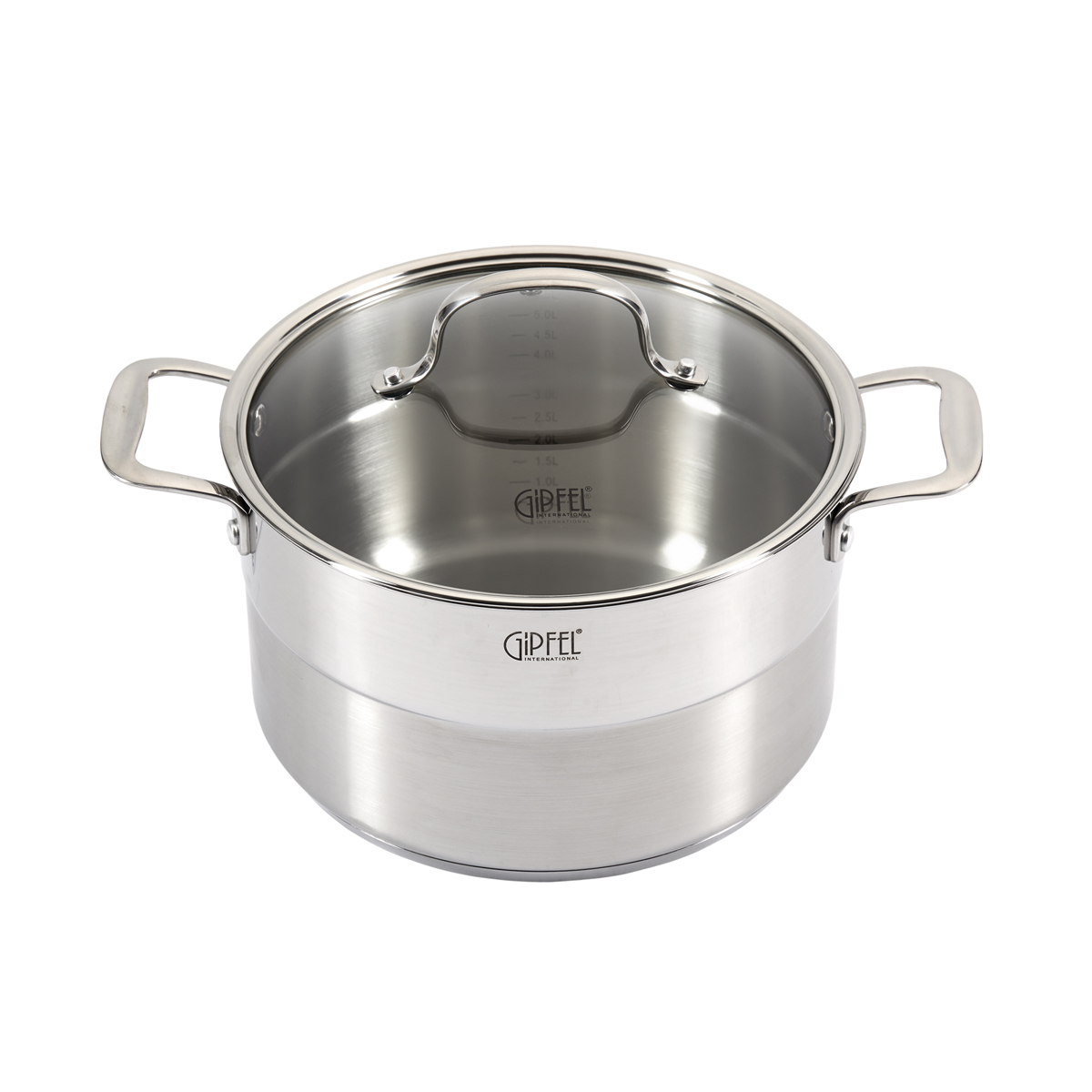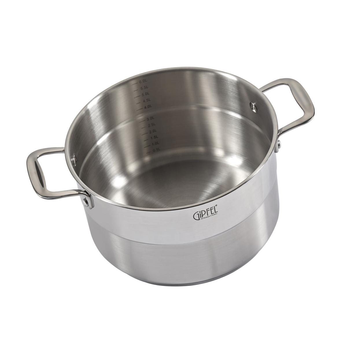 Кастрюля из нержавеющей стали Gipfel Gala 1275. Объем данной модели 6 л, размер 24х14 см. Сделана из нержавеющей стали 18/10, блестящая полировка с матированной полосой. В комплекте стеклянная крышка. Капсульное дно обеспечивает равномерный нагрев кастрюли. Подходит для всех плит, включая индукционные. Упакована в фирменную коробку Gipfel.