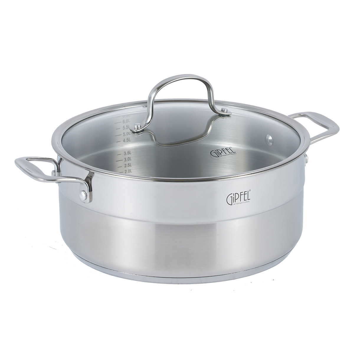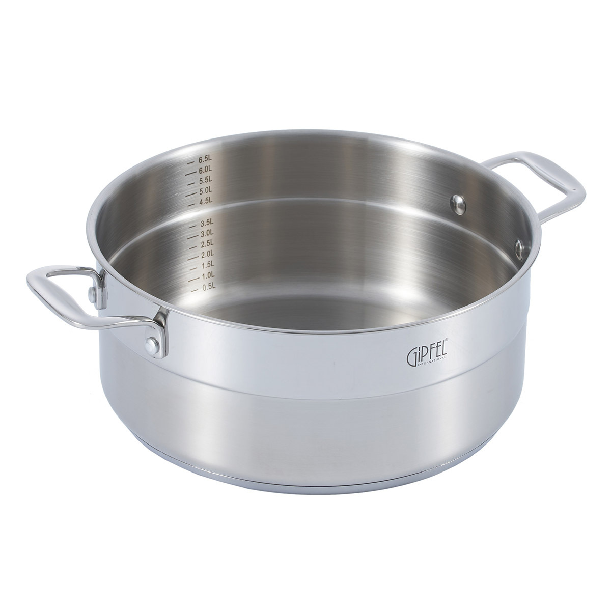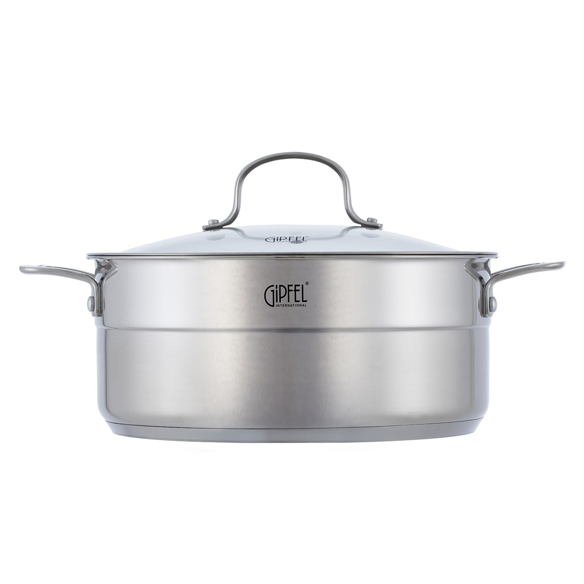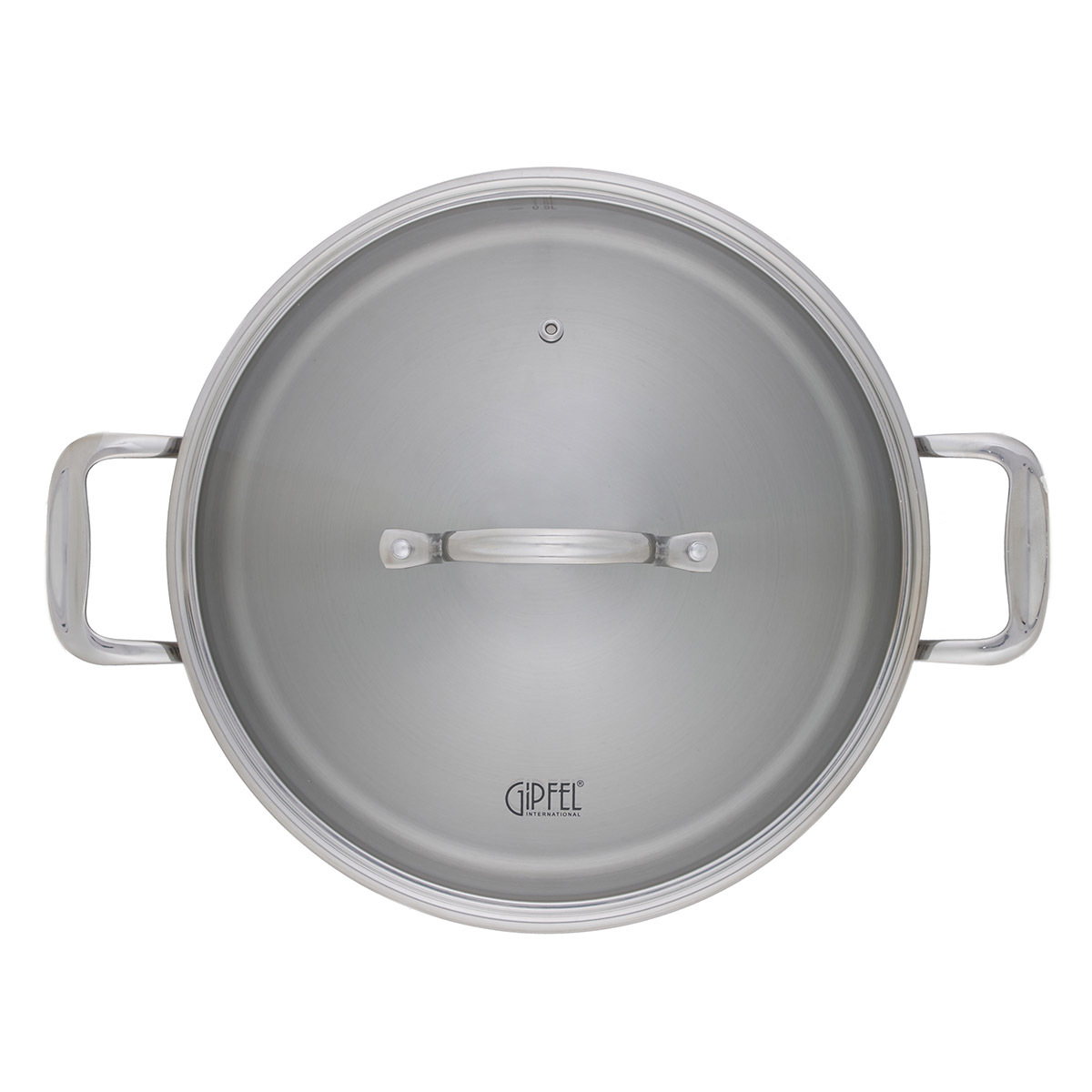 Кастрюля из нержавеющей стали Gipfel Gala 2276. Объем данной модели 7 л, размер 28х12 см. Сделана из нержавеющей стали 18/10, блестящая полировка с матированной полосой. В комплекте стеклянная крышка. Капсульное дно обеспечивает равномерный нагрев кастрюли. Подходит для всех плит, включая индукционные. Упакована в фирменную коробку Gipfel.