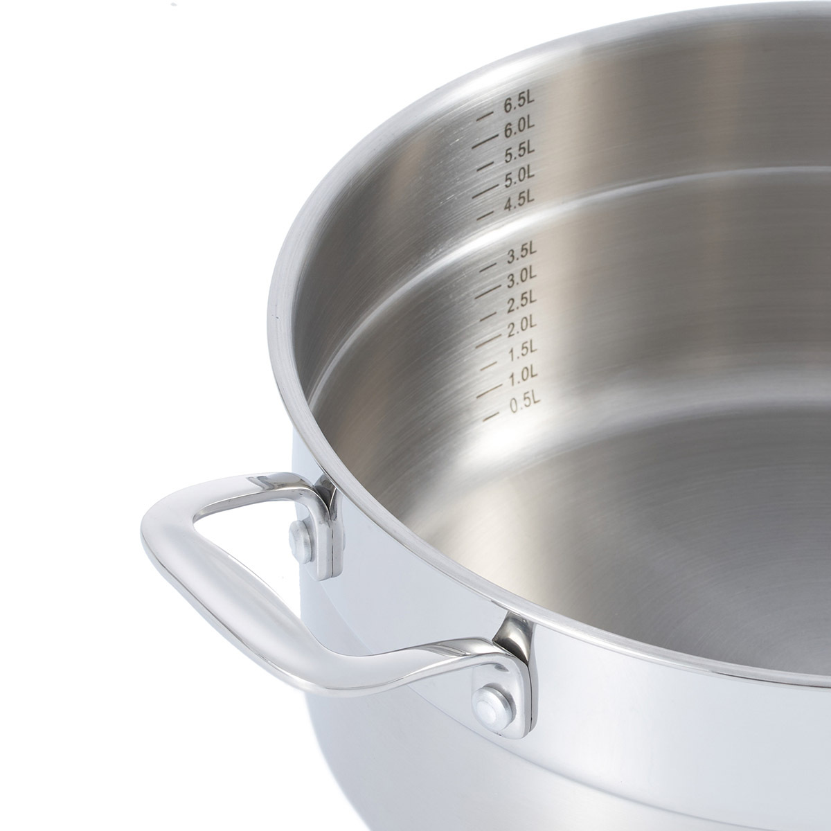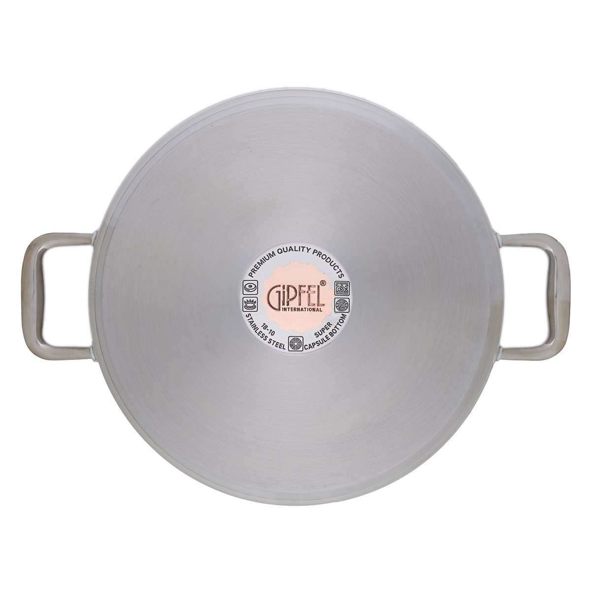 Нержавеющая сталь марки 18/10. Стеклянная крышка с отверстием для выпуска пара. Диаметр 28 см, высота 12 см, толщина стенок 0,7 мм, толщина дна 5 мм, объем 7 л. Блестящая полировка с матированной полосой, многослойное теплоаккумулирующее дно с медной и алюминиевой прослойками обеспечивает быстрый нагрев, и длительное сохранение тепла. Стальные, не нагревающиеся эргономичные ручки. Можно использовать на индукционной плите. Можно мыть в посудомоечной машине. Упакована в фирменную коробку Gipfel. 3-слойное капсулированное дно.