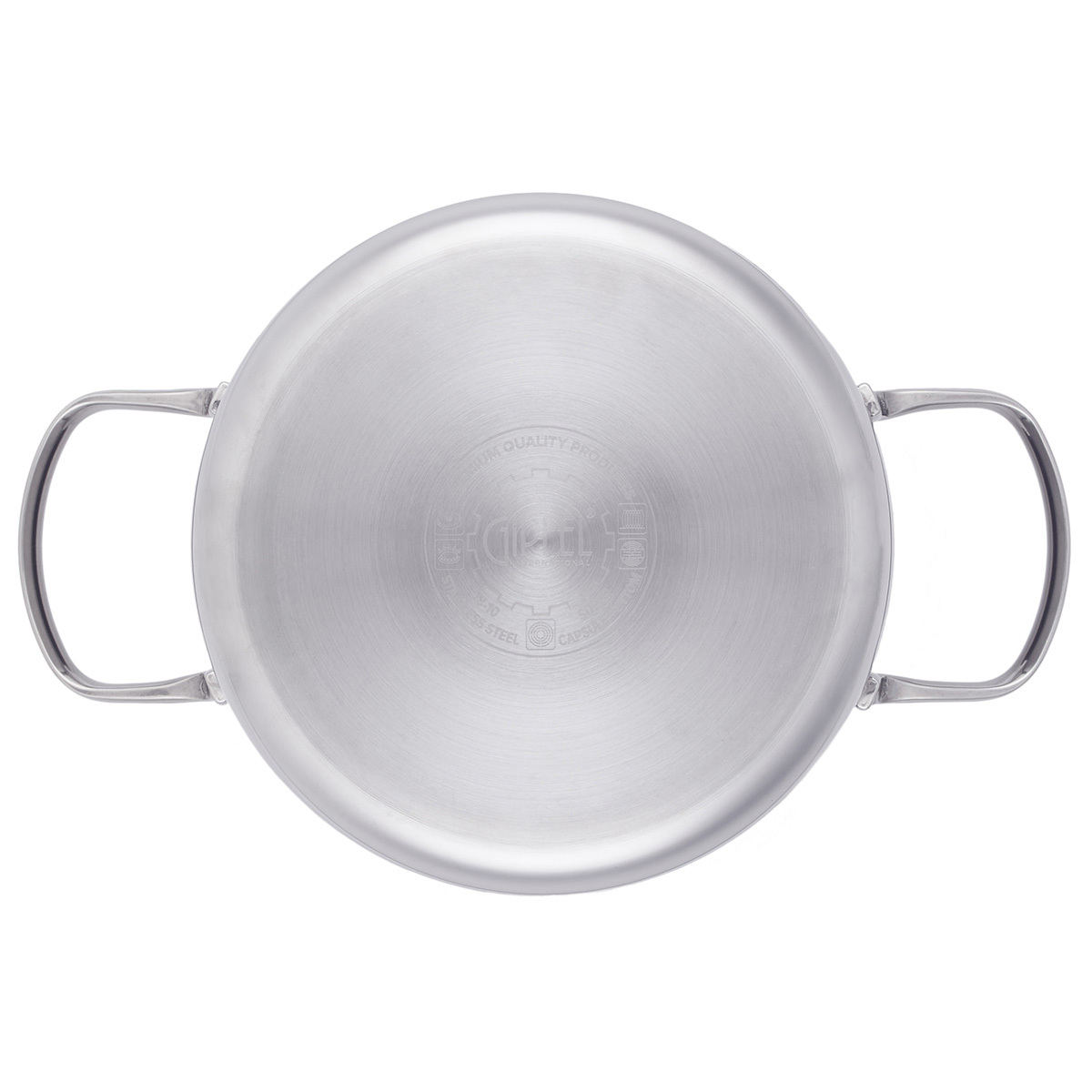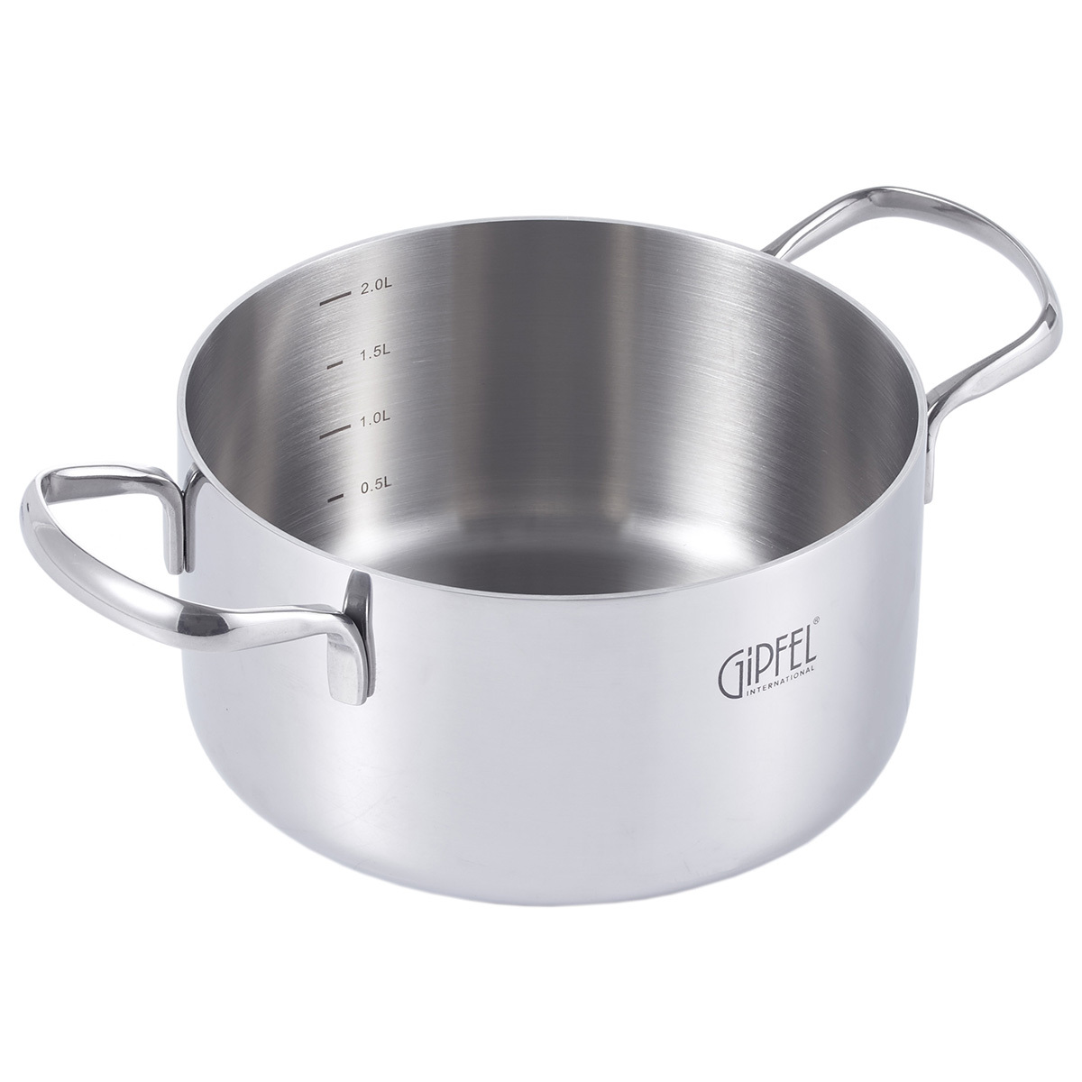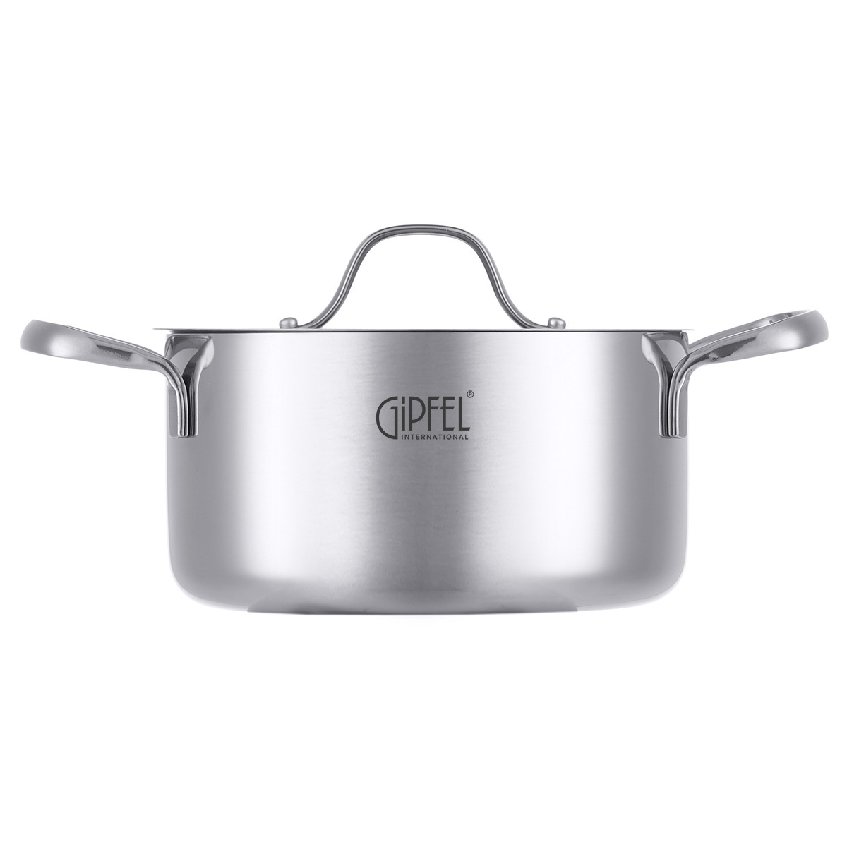 Кастрюля из нержавеющей стали Gipfel Galaxy 51968. Объем данной модели 2,2 л, диаметр 18 см, высота стенок 9,5 см.Толщина – 2,3 мм (нержавеющая сталь 18/10 (0,5 мм) + алюминий (1,3 мм) + нержавеющая сталь 18/0 (0,5 мм)). Между слоями нержавеющей стали, которая с одной стороны соприкасается с поверхностью плиты, а с другой стороны контактирует с едой, заключен слой алюминия. Алюминий запаян внутрь стальной оболочки.