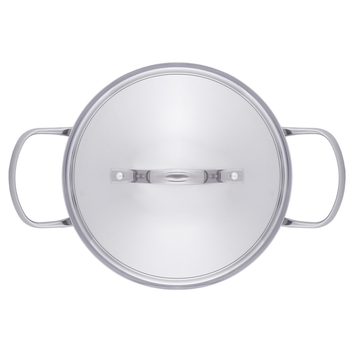 Данная модель со стальной крышкой толщиной 0,7 мм, без отверстий для пара, с клёпочным креплением ручки. Она легко впишется в современный кухонный дизайн. Кастрюля упакована в коробку.
