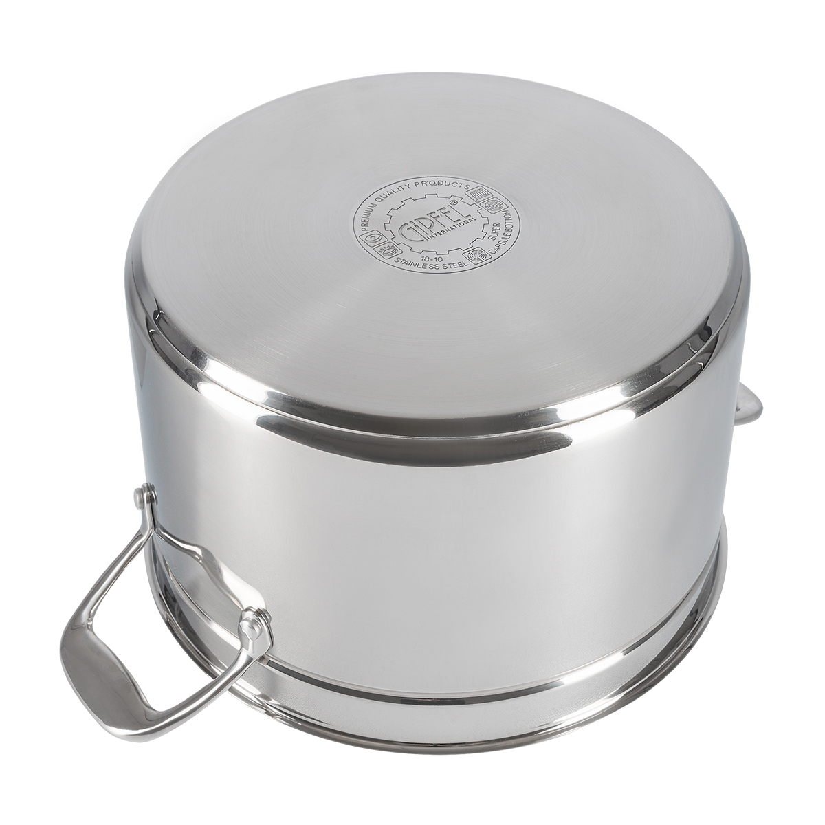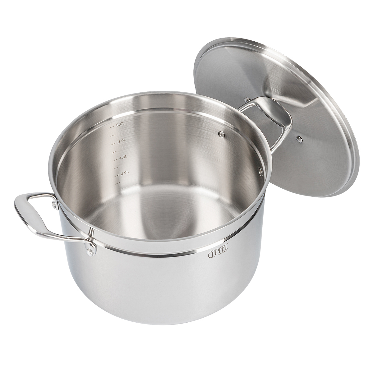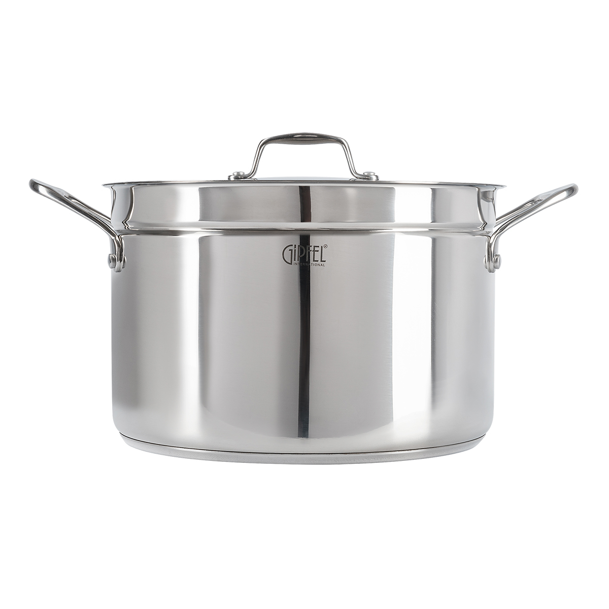 Кастрюля Gipfel Grande 51702. Объем 11 л, размер 28x18 см. В комплекте стальная крышка. Внутри нанесена мерная шкала до 8 литров с шагом в 1 литр. Изготовлена из нержавеющей стали 18/10. Толщина стенок 0,7 мм. Капсульное дно обеспечивает равномерный нагрев кастрюли. Подходит для всех плит, включая индукционные.
