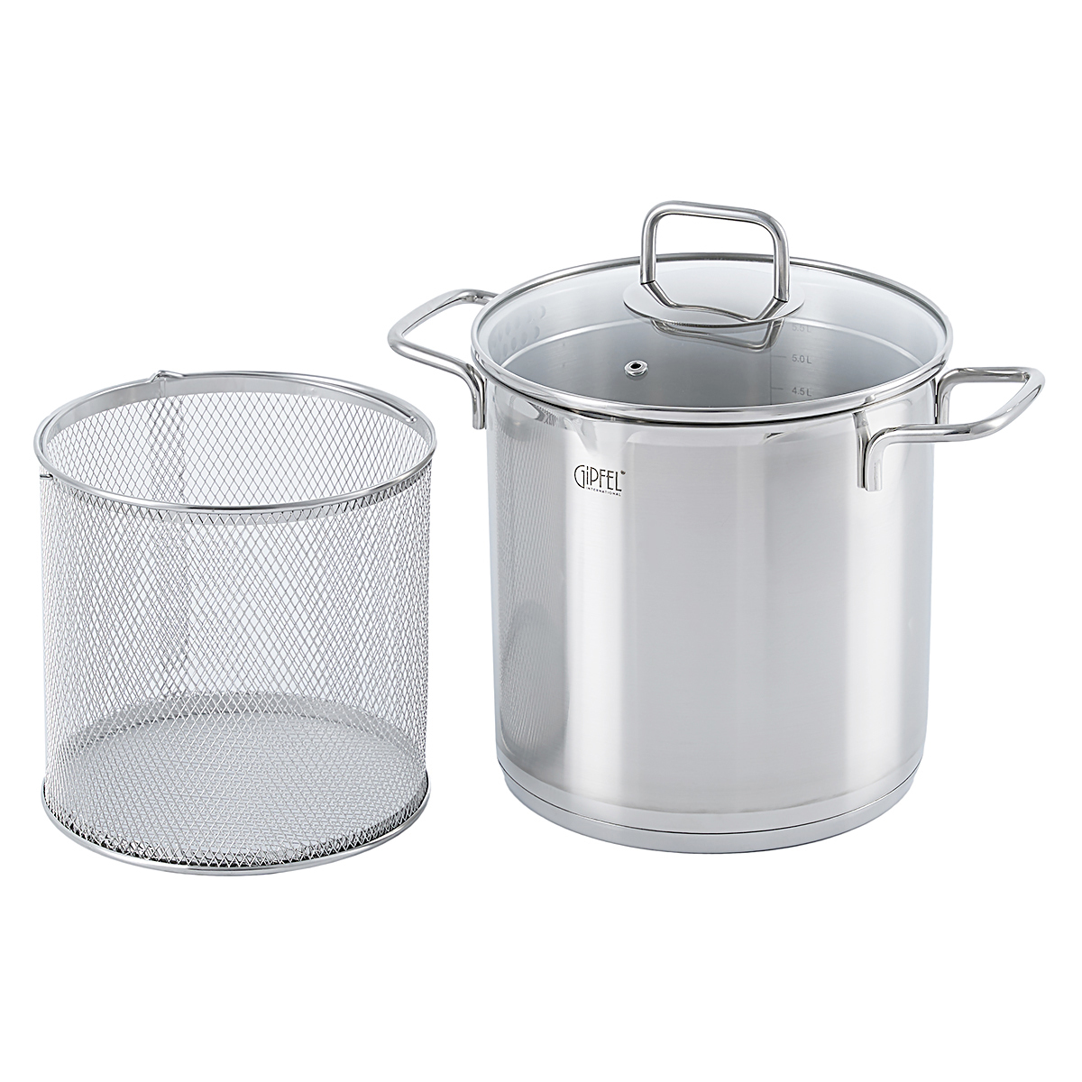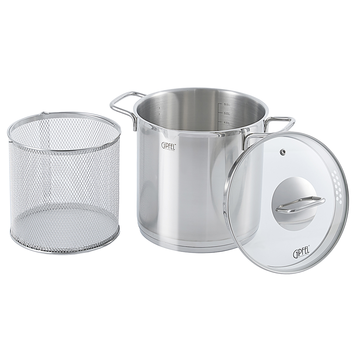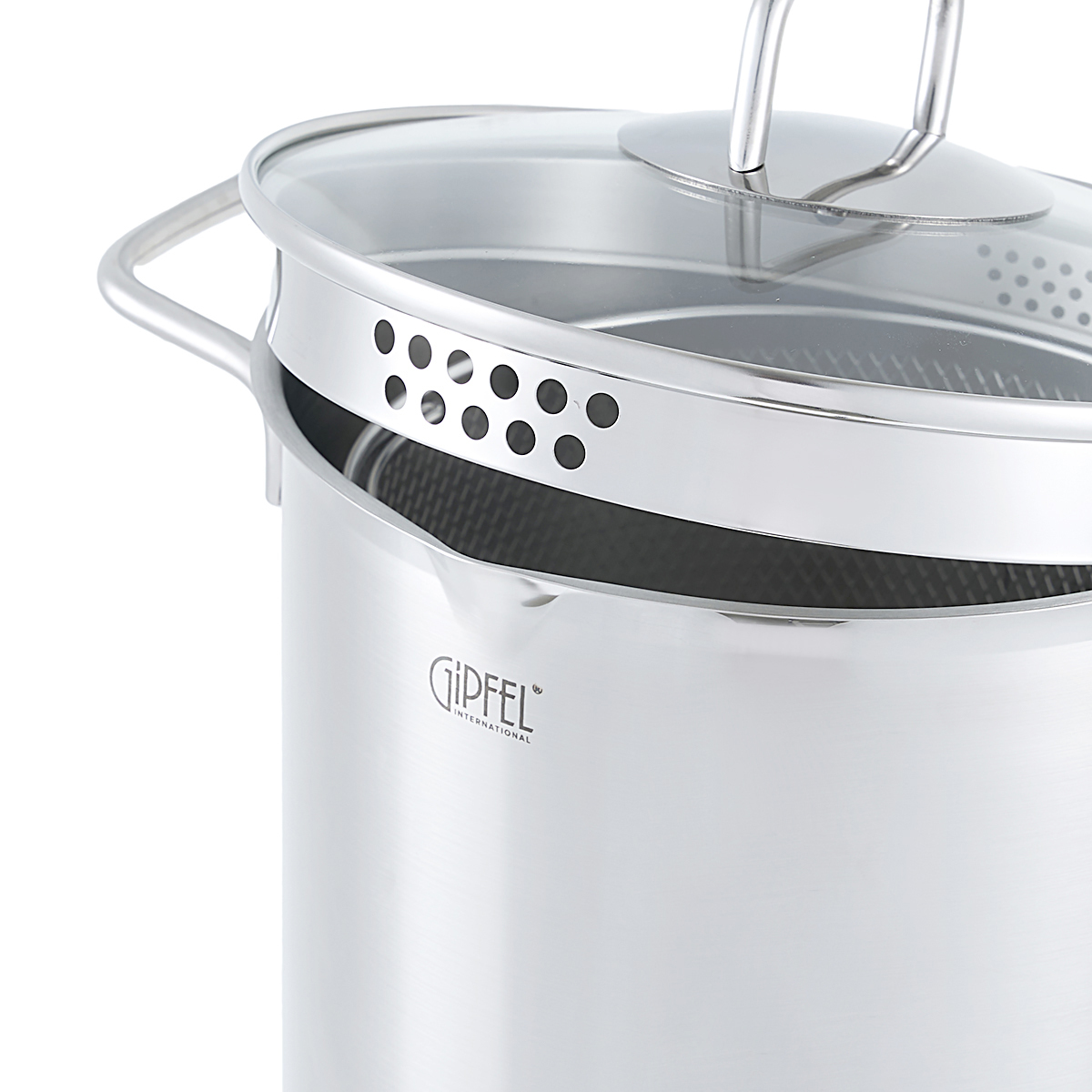 В случае необходимости кастрюлю можно использовать и без сетки. Кастрюля Gipfel Itum в комплекте с прозрачной крышкой из стекла с отверстиями для слива и для выхода пара.