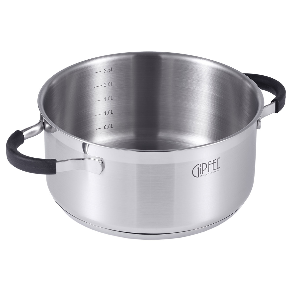 Кастрюля из нержавеющей стали Gipfel Metropole 1734 диаметром 20 см и объемом 2,5 л. Толщина корпуса составляет 0,6 мм, дно всех моделей серии толщиной 3 мм оборудовано капсульной вставкой и подходит для индукционных плит.