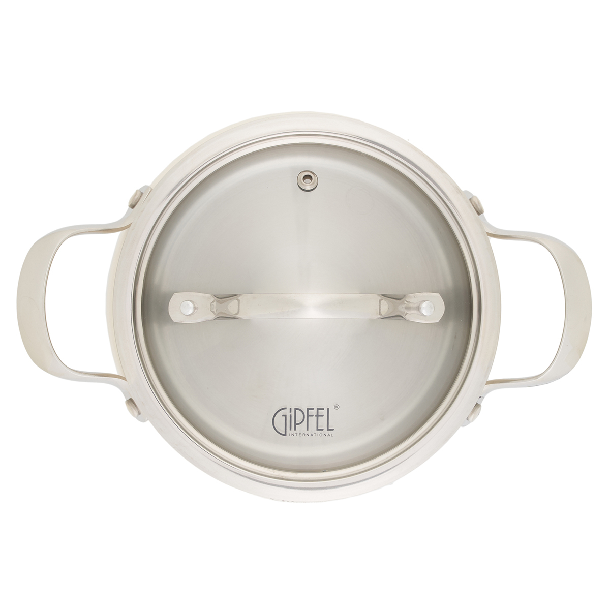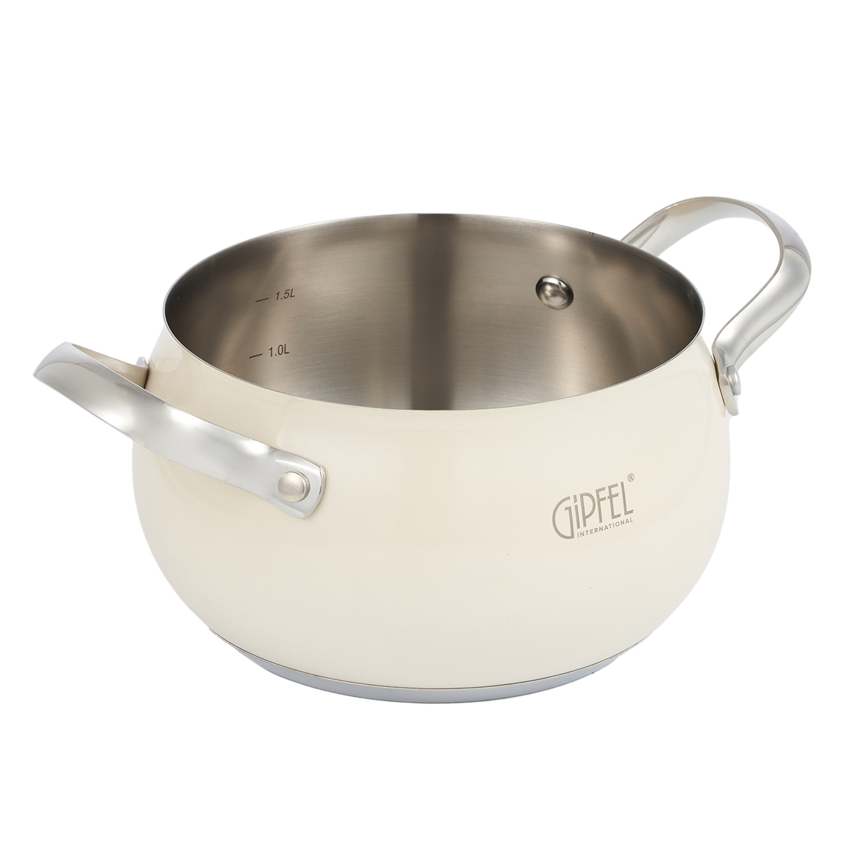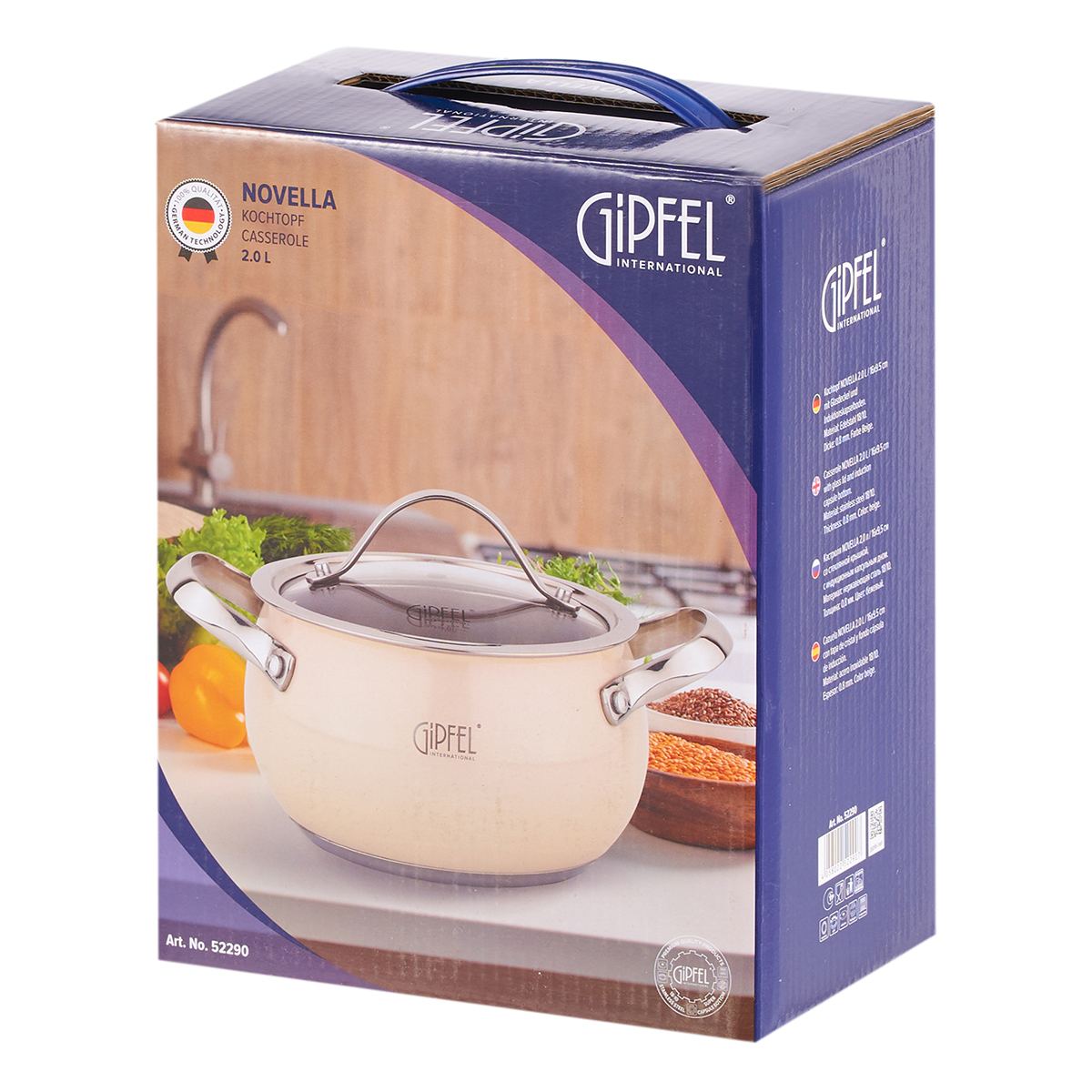 Кастрюля из нержавеющей стали Gipfel Novella 52290. Объем данной модели 2 л, диаметр 16 см, высота стенок 9,5 см.Толщина дна 6,3 мм, стенок – 0,8 мм.