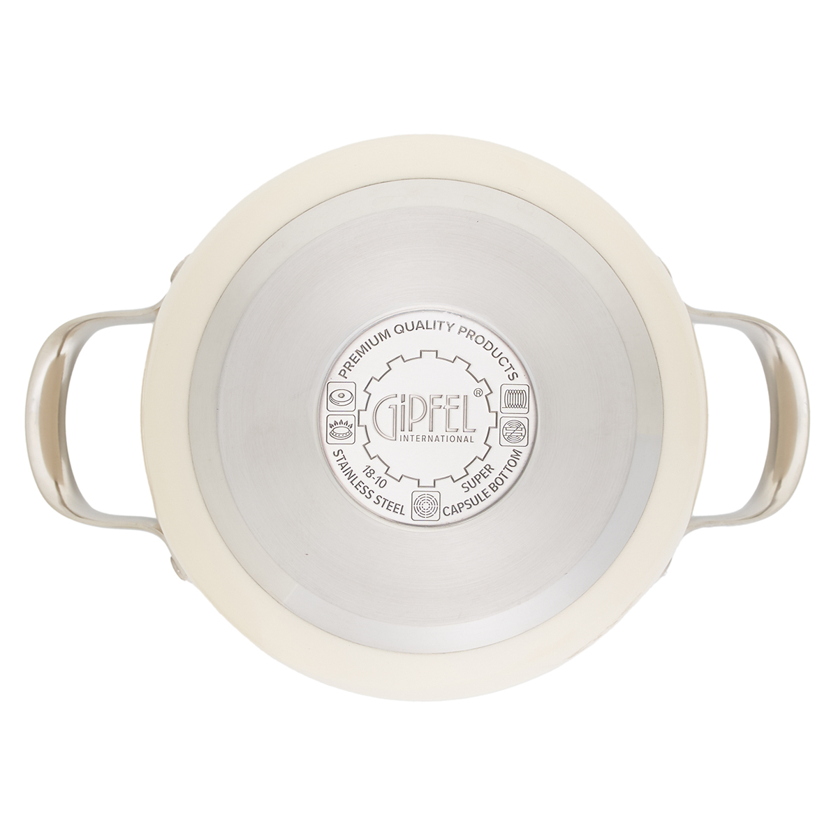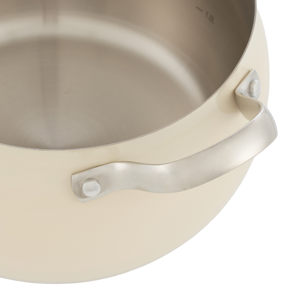 Кастрюля обладает прочной конструкцией и высоким качеством материалов, что обеспечивает долговечность и надежность в использовании. Она изящной округлой формы, которая придает ей особый шарм и уникальность, выполнена в цвете французской ванили с мерцающим блеском.