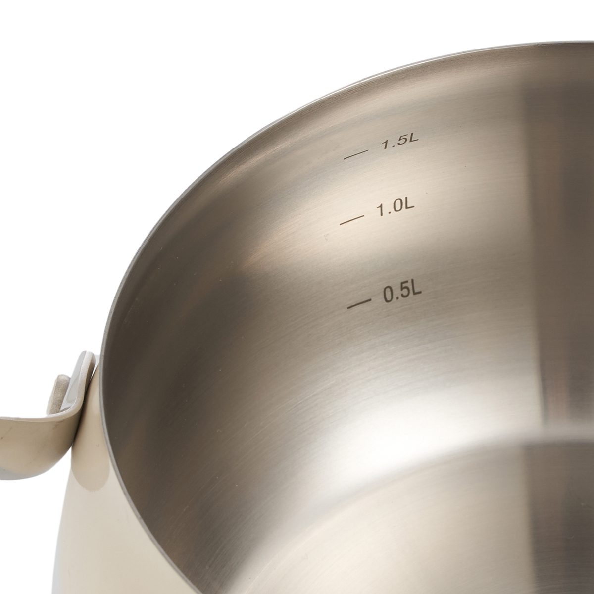 Внутри кастрюли атласная полировка и нанесена мерная шкала, с помощью которой удобно отмерить нужное количество воды и следить за ее уровнем.