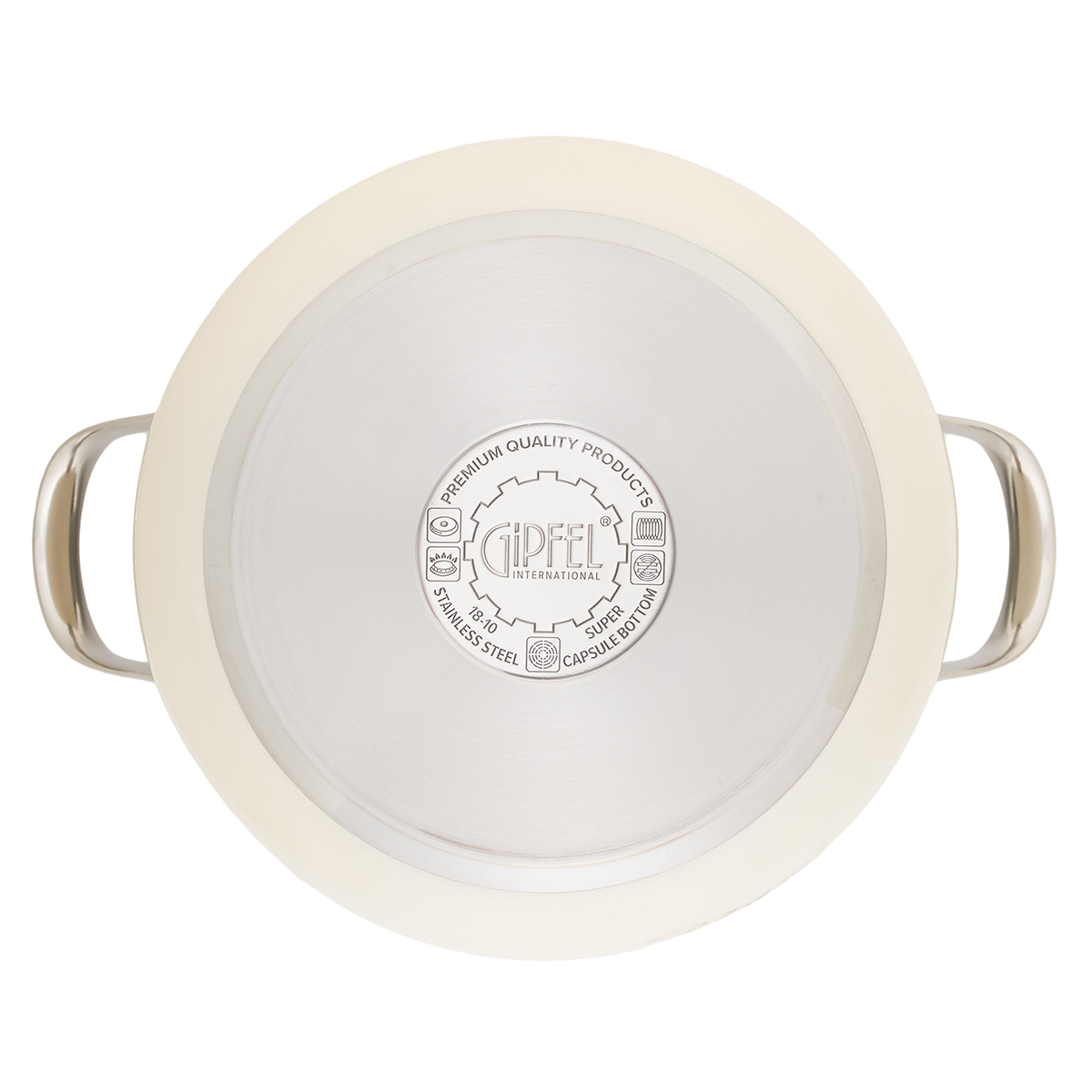 У кастрюли индукционное 3-слойное капсульное дно: при приготовлении пища нагревается равномерно и не подгорает, стенки кастрюли не ломаются и не деформируются при использовании на различных видах плит.