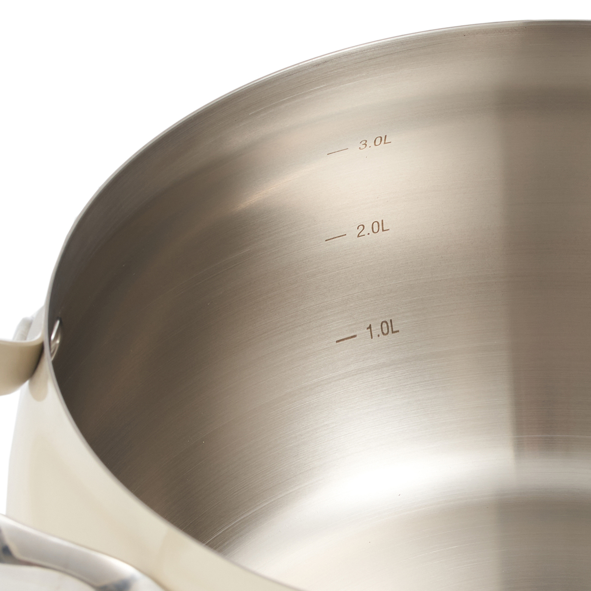 Внутри кастрюли атласная полировка и нанесена мерная шкала, с помощью которой удобно отмерить нужное количество воды и следить за ее уровнем.