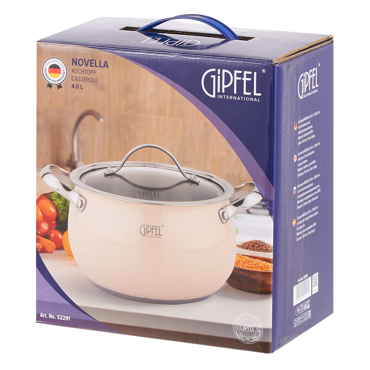 Кастрюля из нержавеющей стали Gipfel Novella 52291. Объем данной модели 4 л, диаметр 20 см, высота стенок 12 см.Толщина – 0,8 мм.
