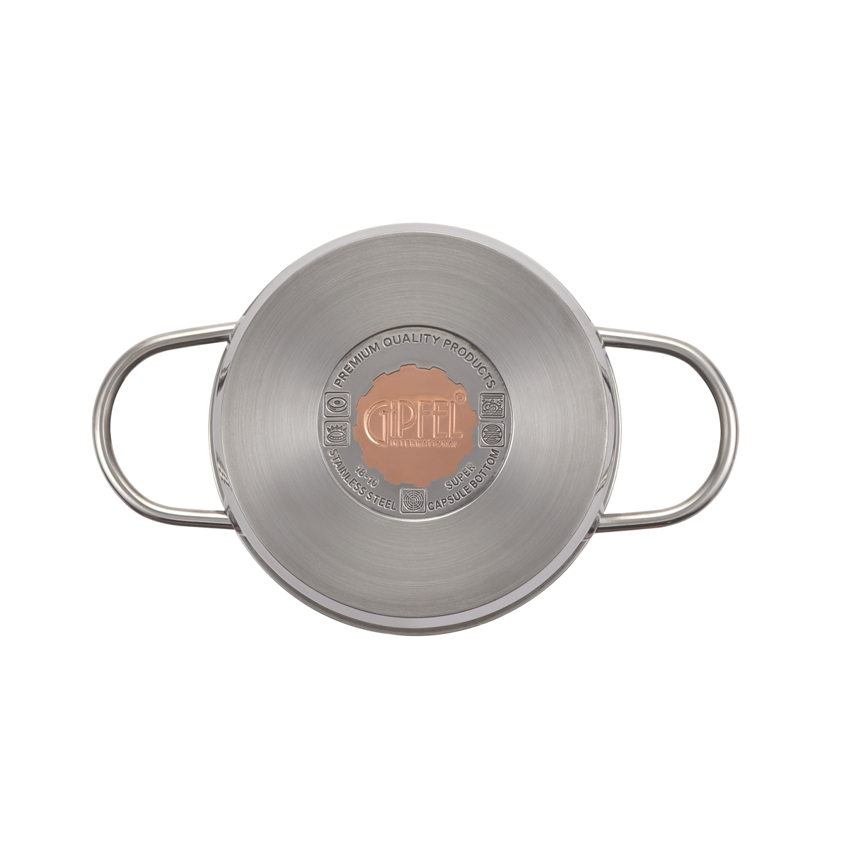 Серия кастрюль Signo изготовлена из высококачественной нержавеющей стали марки 18/10, которая обладает повышенной прочностью и является максимально безопасным для человека материалом. Этот материал имеет ровную поверхность, практически лишенную микропор, поэтому вредоносным бактериям практически негде скапливаться. Капсулированное трехслойное дно, состоящее из двух слоев стали и теплопроводного алюминия между ними, обеспечивает быстрый и равномерный нагрев посуды. Серия Signo прекрасно подходит под любые типы плит, в том числе, индукционные, а также легко моется, как вручную, так и в посудомоечной машине. Объем данной кастрюли составляет 2 литра, в комплект входит стеклянная крышка.