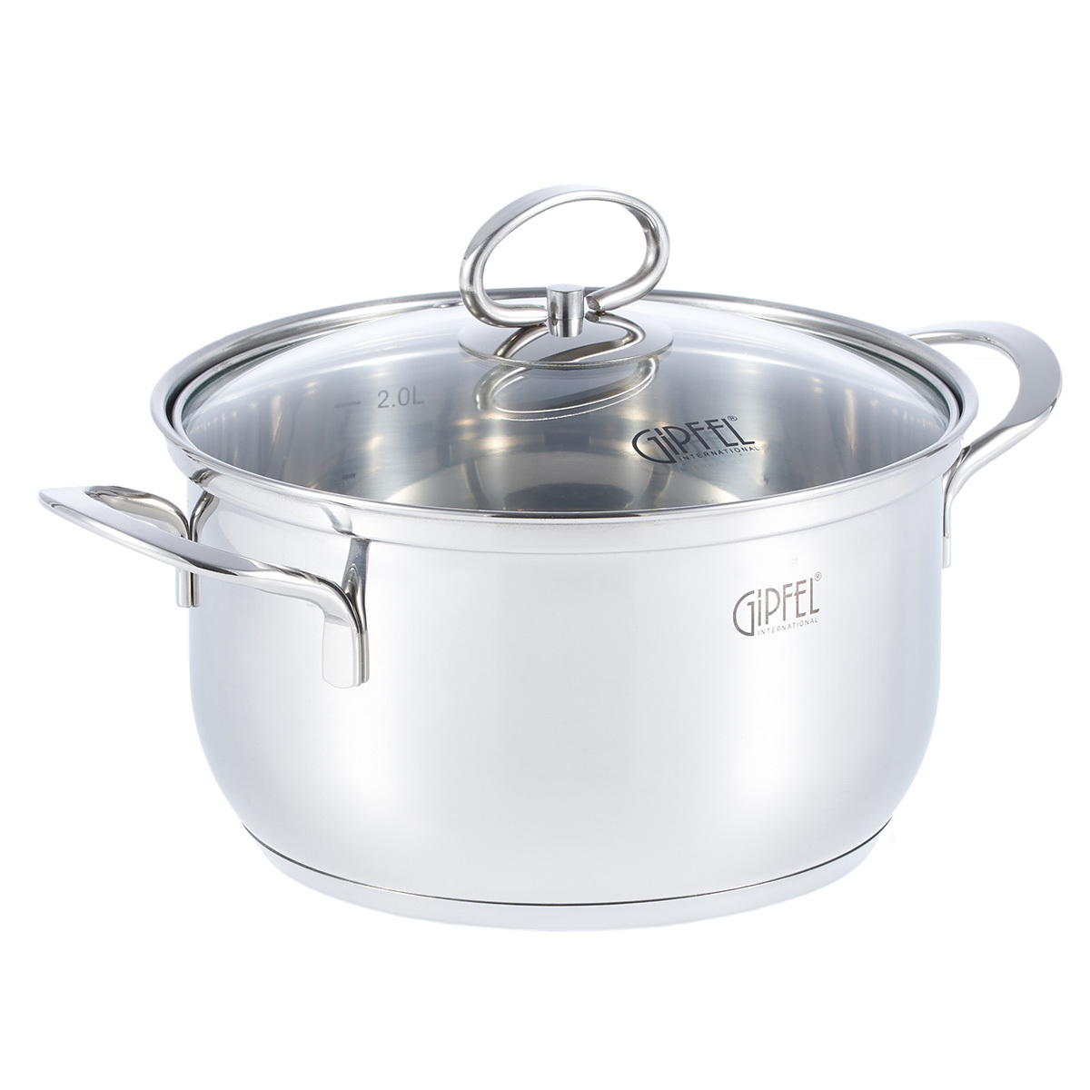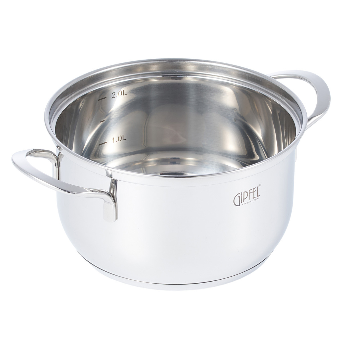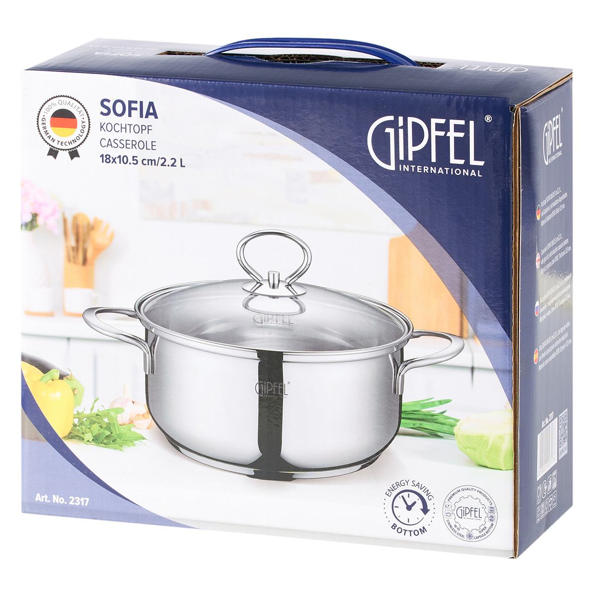Кастрюля Gipfel Sofia 2317. Размер 18x10,5 см, объем 2,2 л. В комплекте со стеклянной крышкой. Толщина стенок 0,5 мм, толщина дна 3 мм.