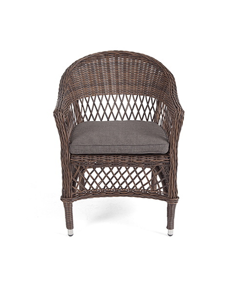 Стул оплетен вручную круглым искусственным ротангом коричневого оттенка. В комплекте представлена мягкая подушка-сиденье серого цвета. Подушка имеет съёмный чехол из полиэстера (100%), плотностью 300гр/м2, с влагоотталкивающей пропиткой.