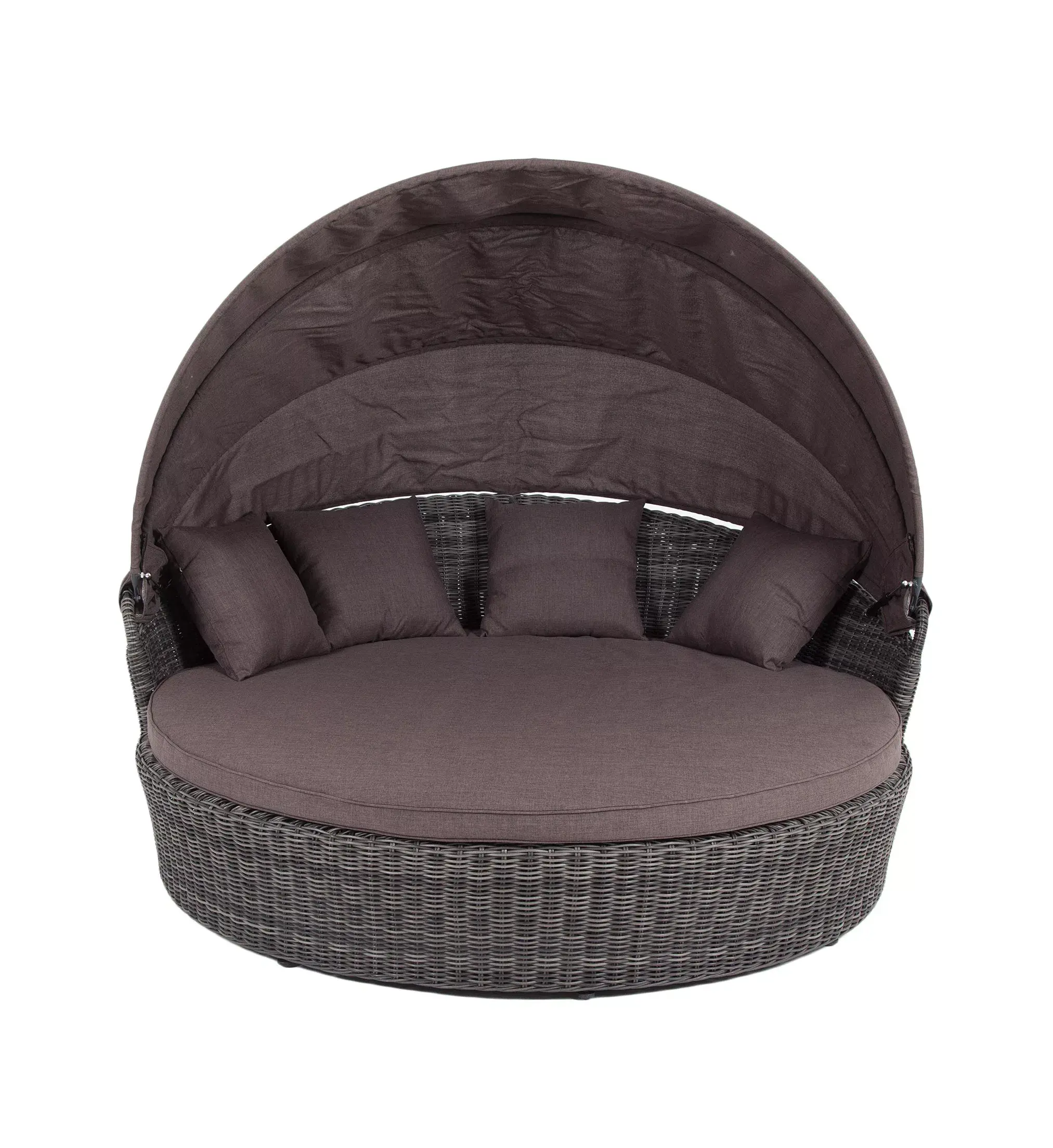 Данная модель имеет в основании прочный алюминиевый каркас, оплетенный вручную круглым ротангом и оснащена регулируемым козырьком, который ограничивает попадание солнечных лучей. Выполнен из водостойкой полиэфирной ткани.