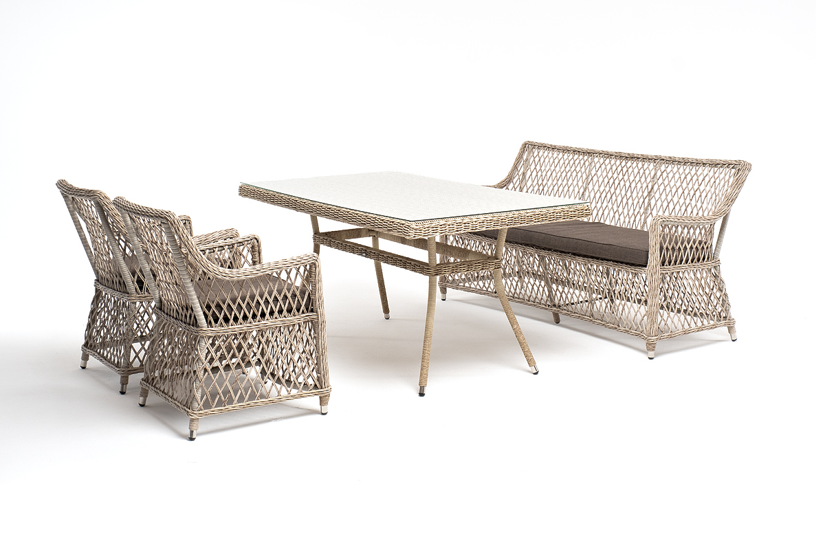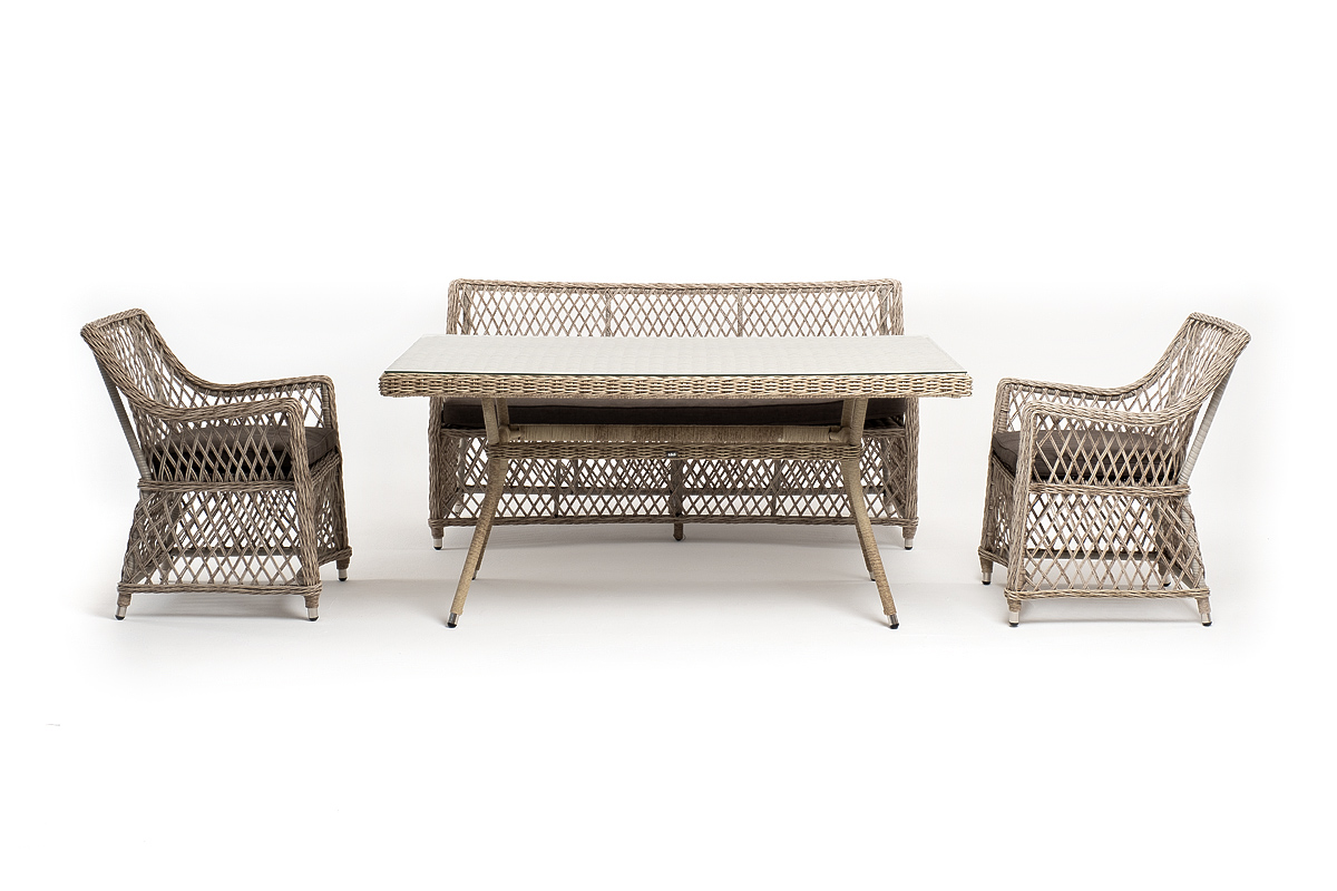 Все предметы мебели изготовлены из прочного алюминия, вручную оплетенного долговечным искусственным ротангом. На креслах и диване предусмотрены подушки со съёмными чехлами и влагостойкой пропиткой. Стол укомплектован прочным стеклом толщиной 5 мм для удобства использования.